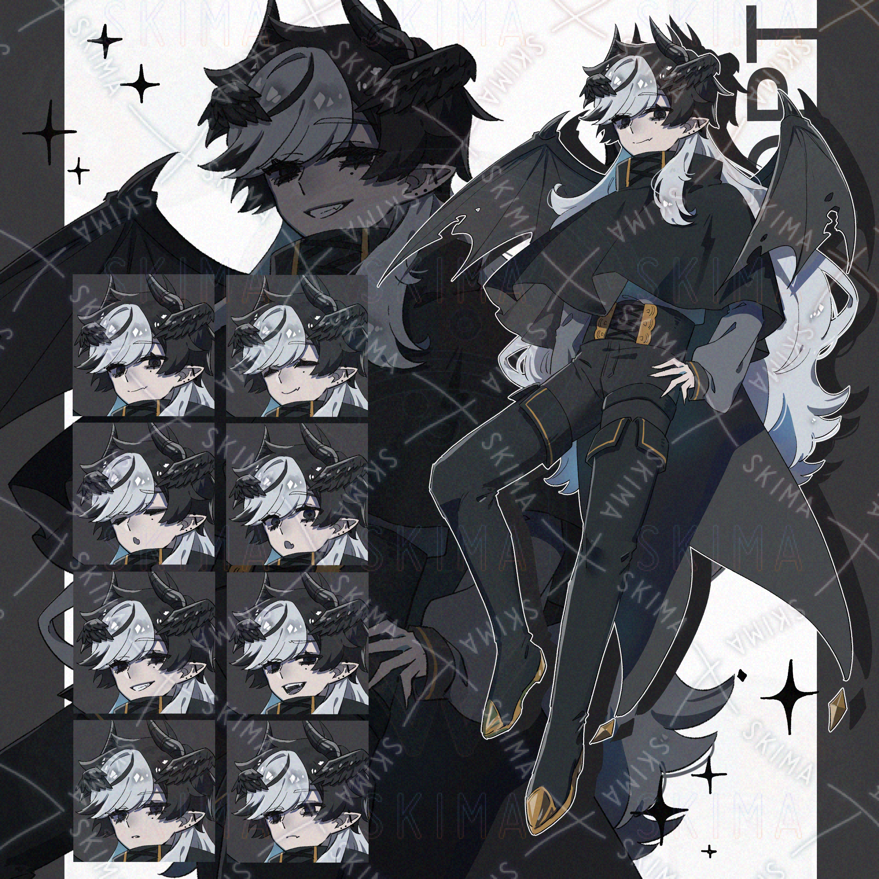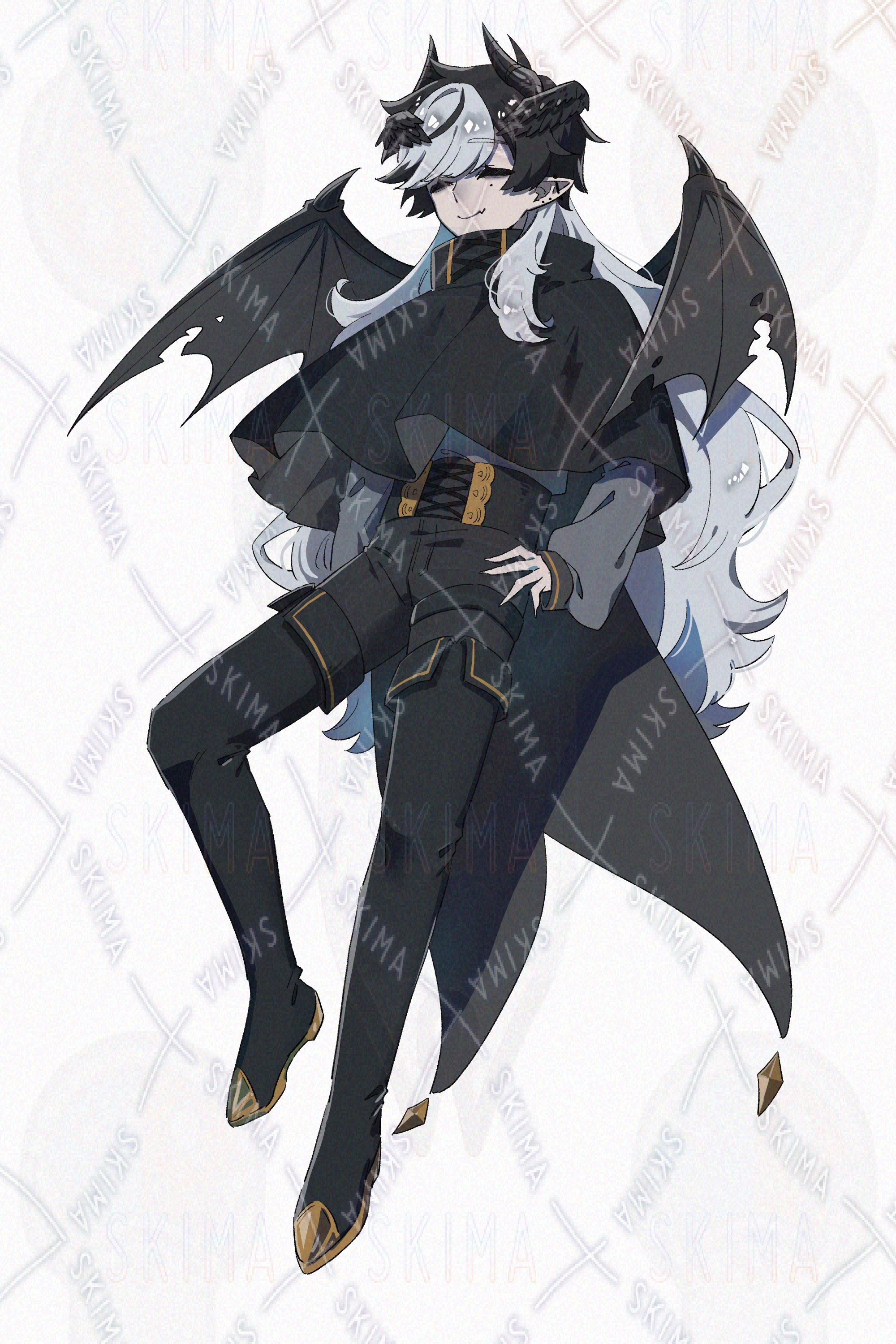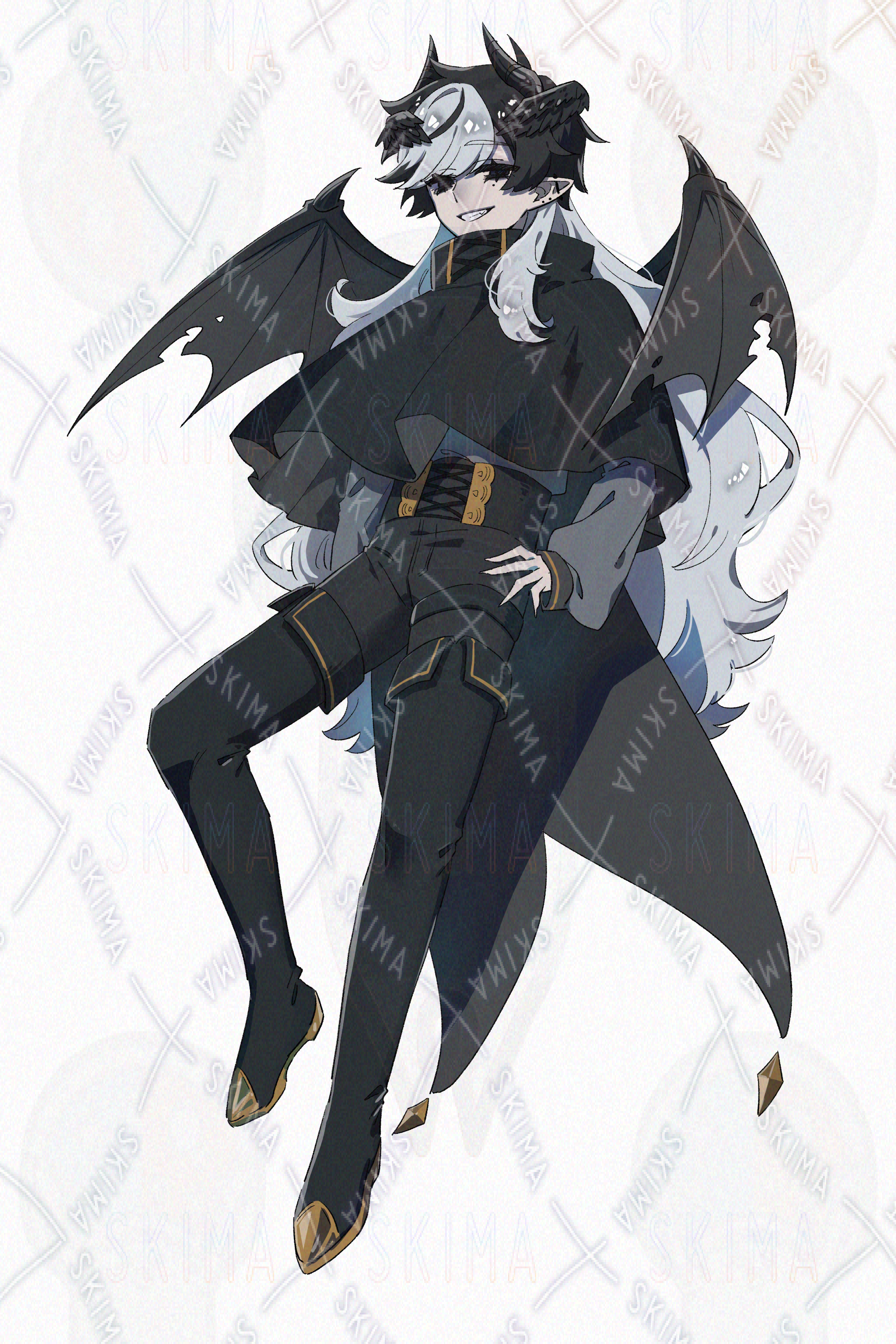 黒と白の髪にやぶれた翼を持つ黒い悪魔の立ち絵です。
