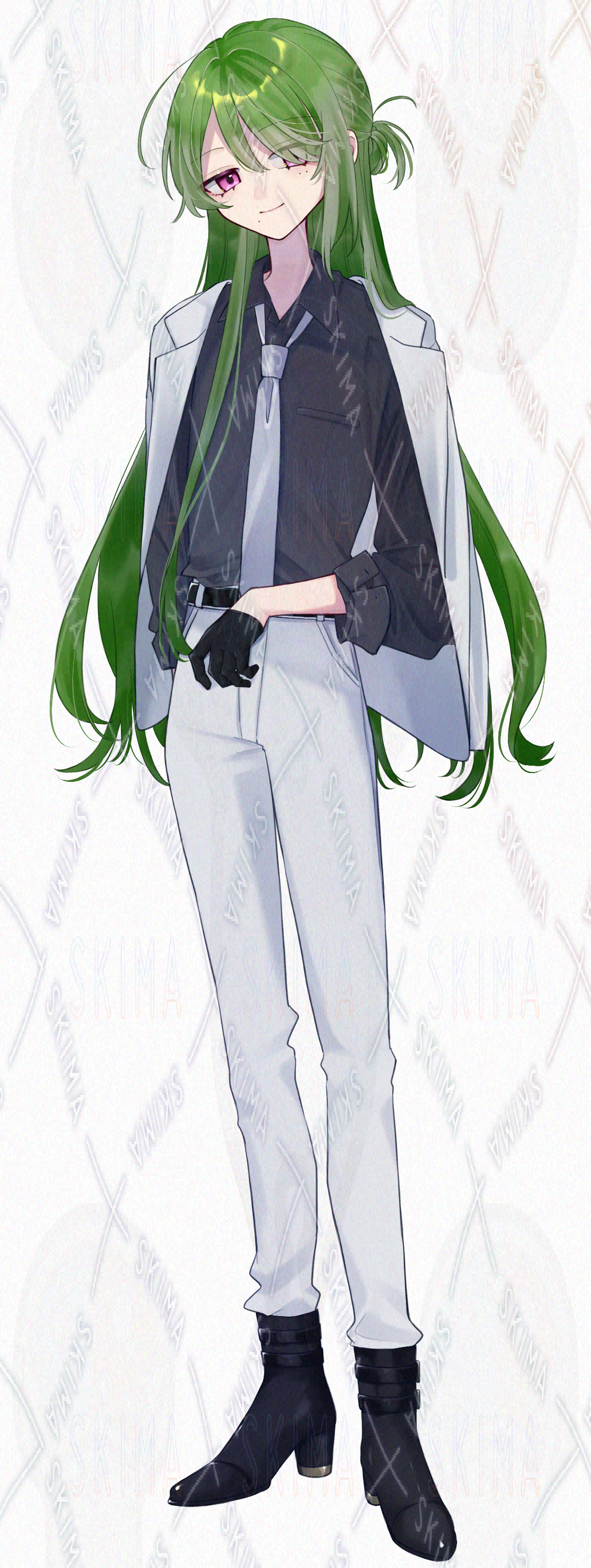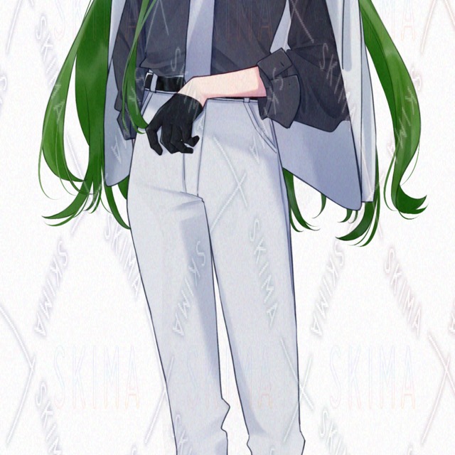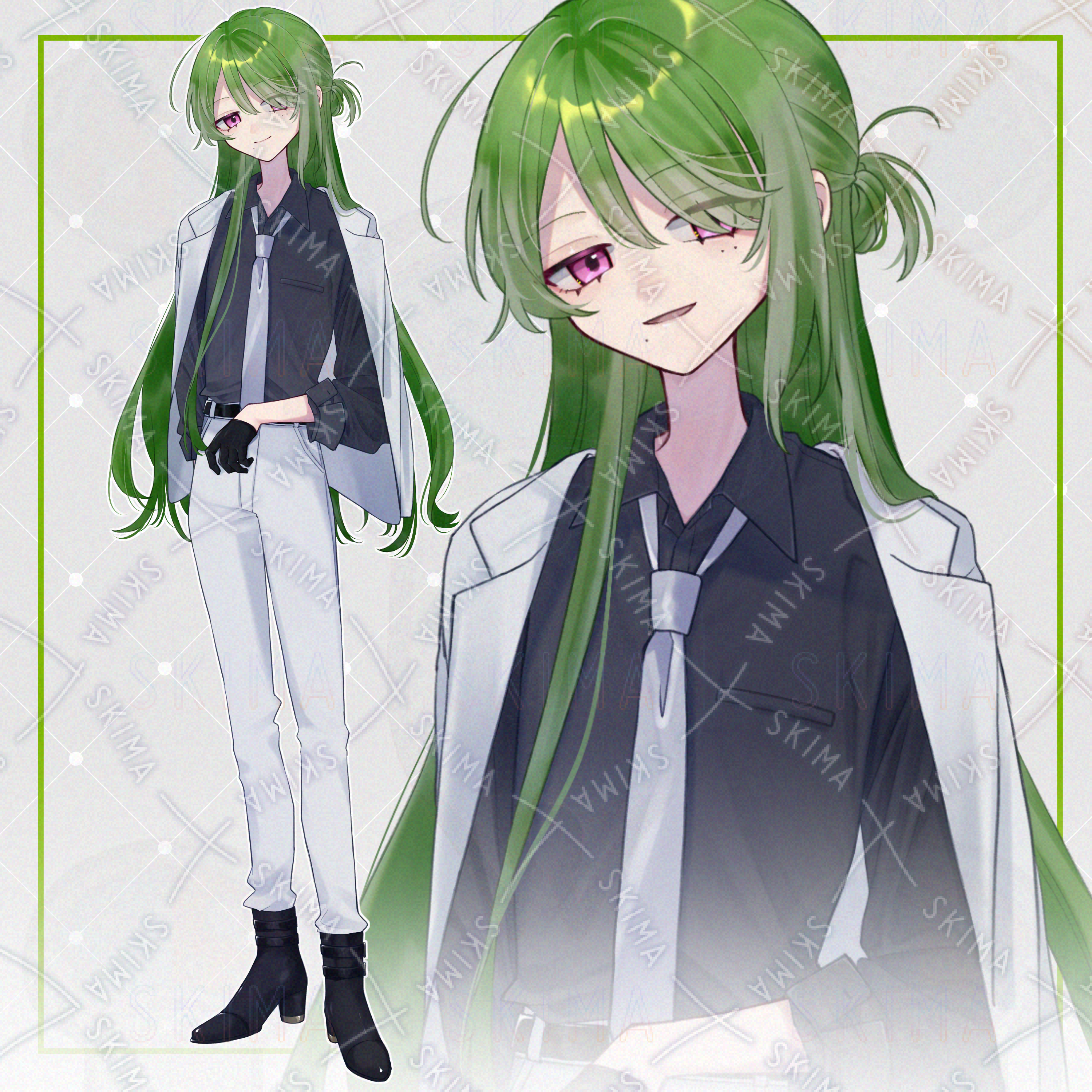 検索用キーワード:中性/スーツ/長髪/緑髪/ピンク目/手袋/ほくろ