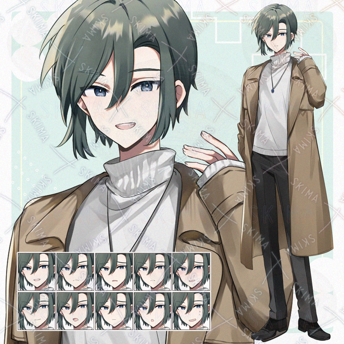 緑髪太眉のタートルニットにトレンチコートを男性の立ち絵です。
