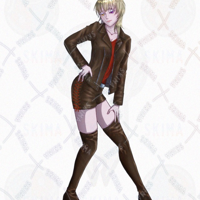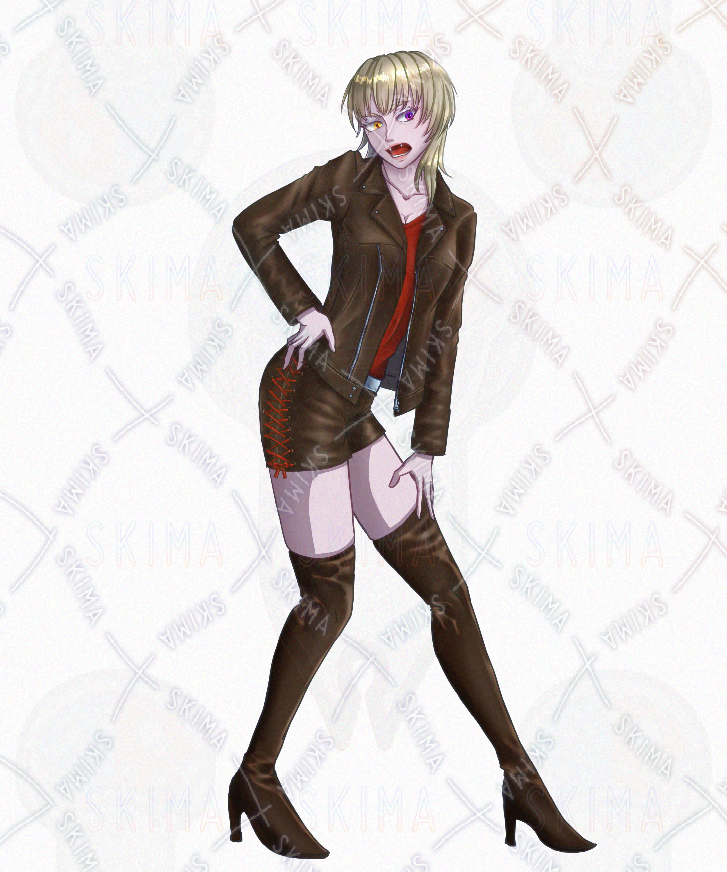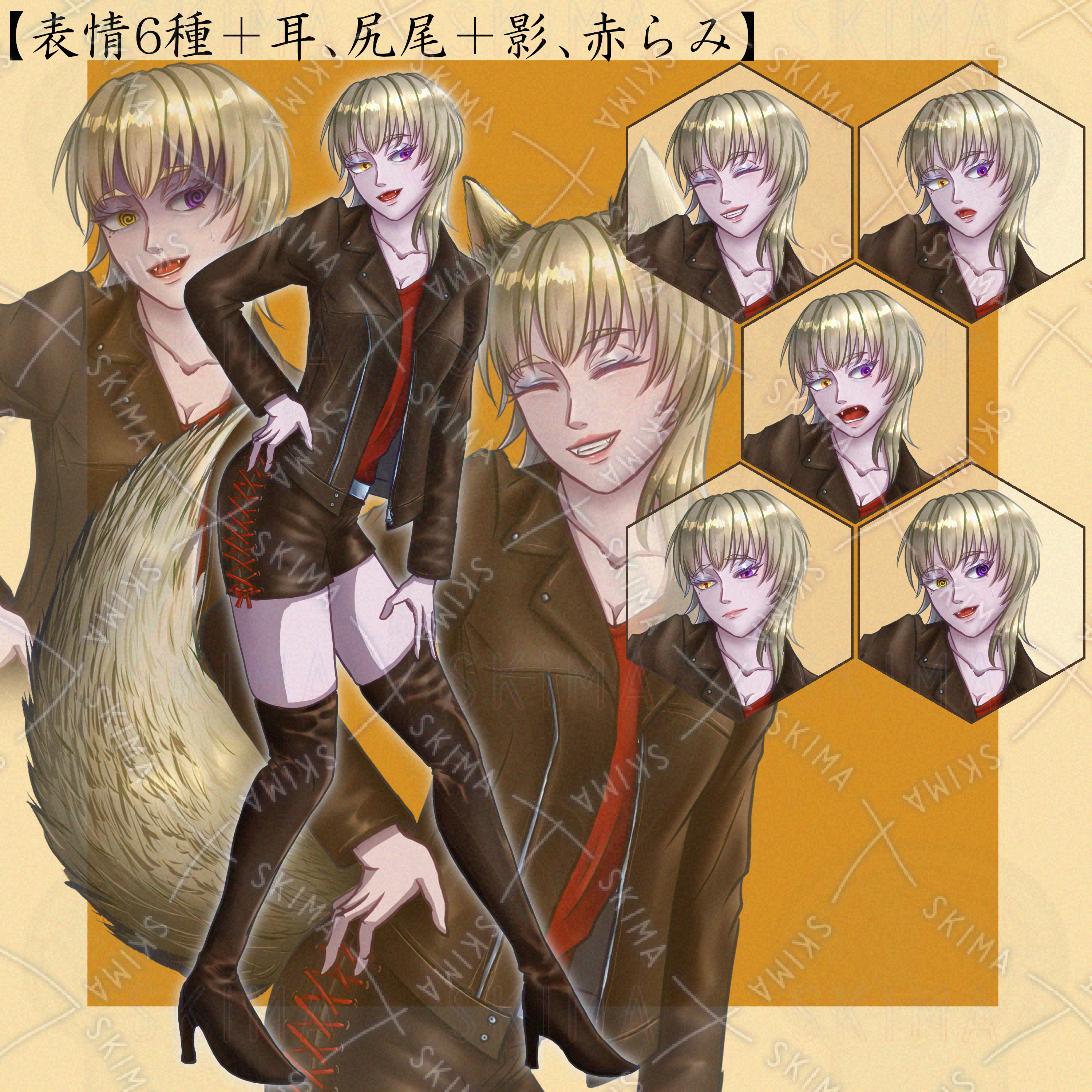 金髪 / ギャル / ウルフカット / オッドアイ / 革ジャケット / クール / セクシー / ケモ耳 / 狐 / 八重歯 / ファンタジー