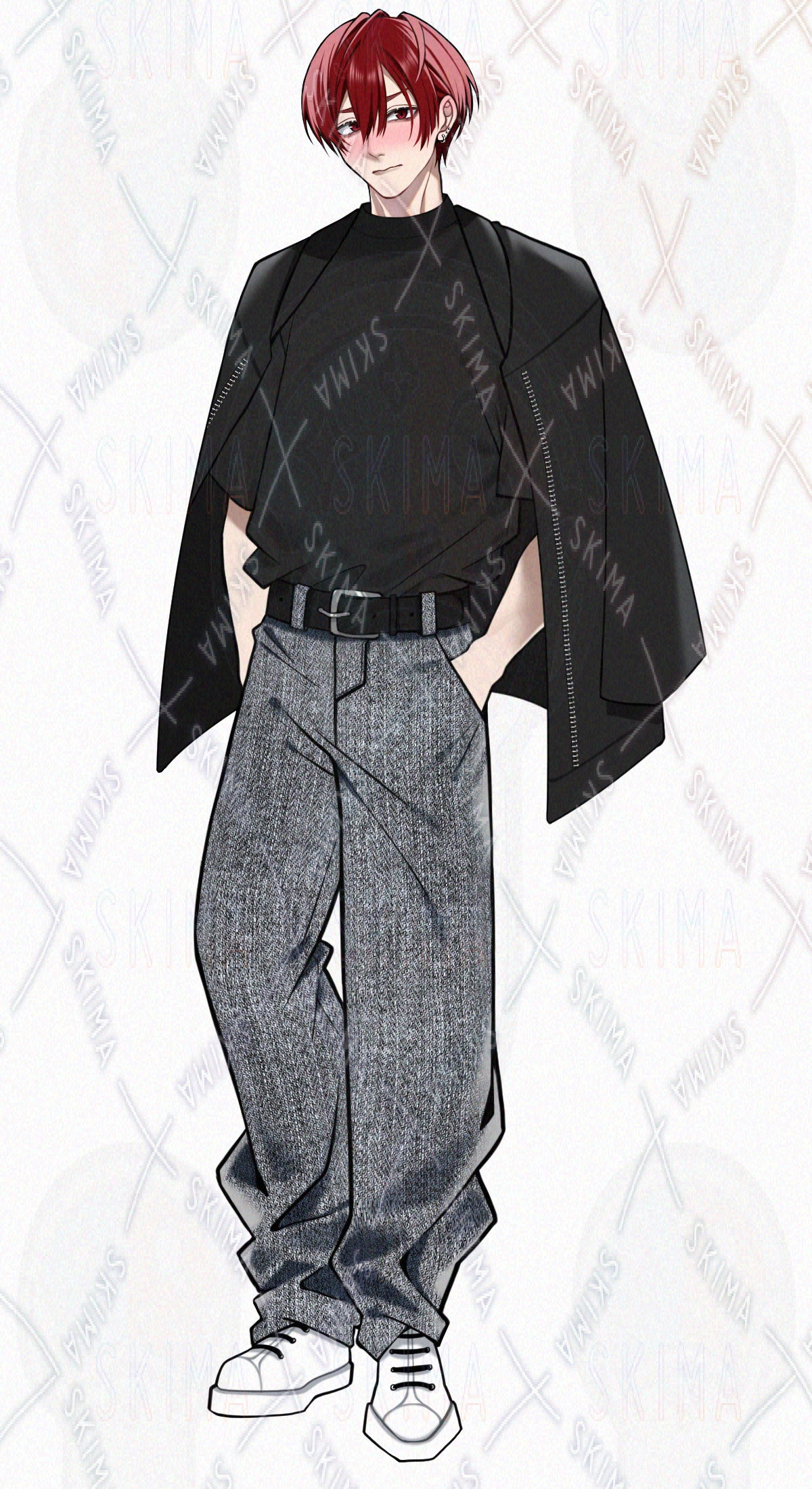 男性/男の子/男性キャラクター/立ち絵/赤髪/赤眼/ジーンズ/TRPG/全身/短髪/モノトーン/スニーカー/Tシャツ/モノクロ