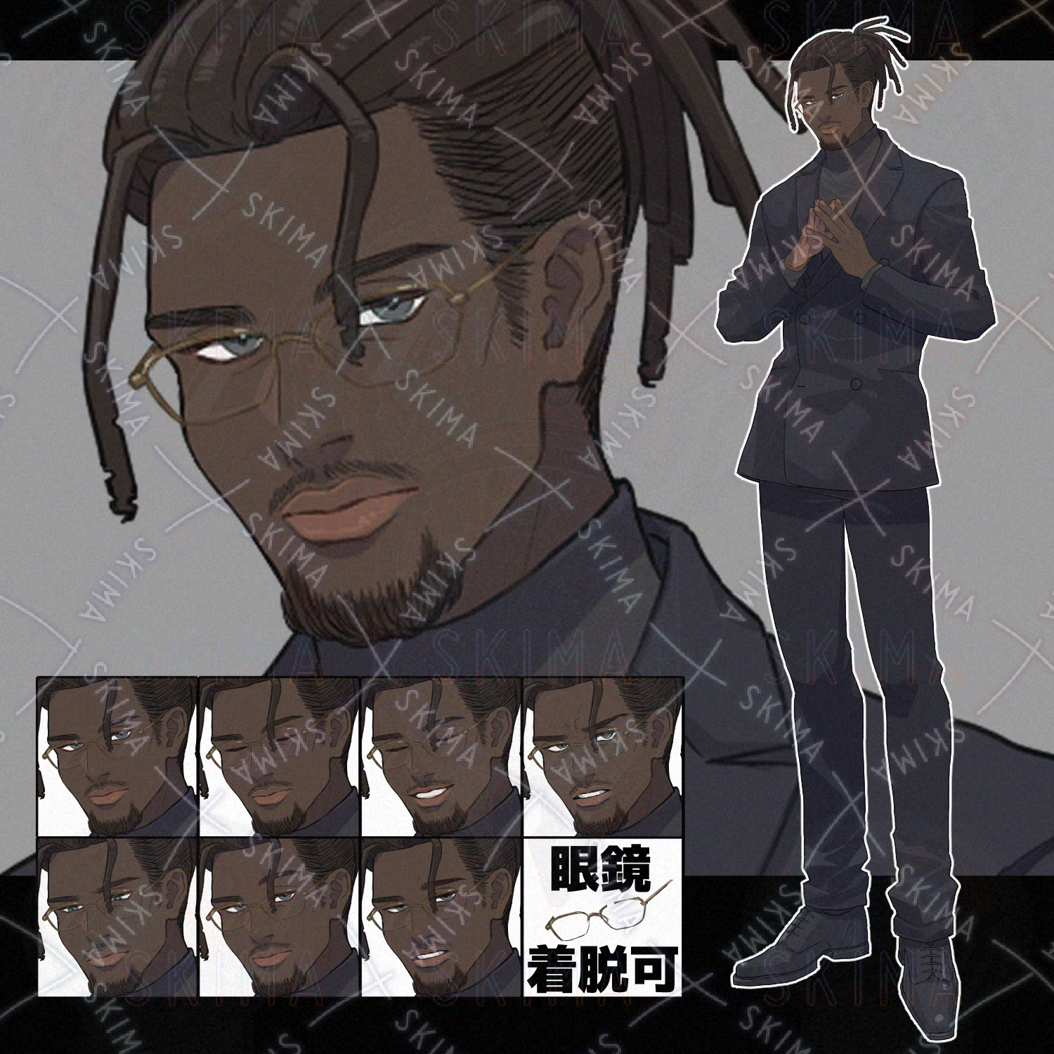 ダブルスーツで眼鏡なアフリカ系男性です。