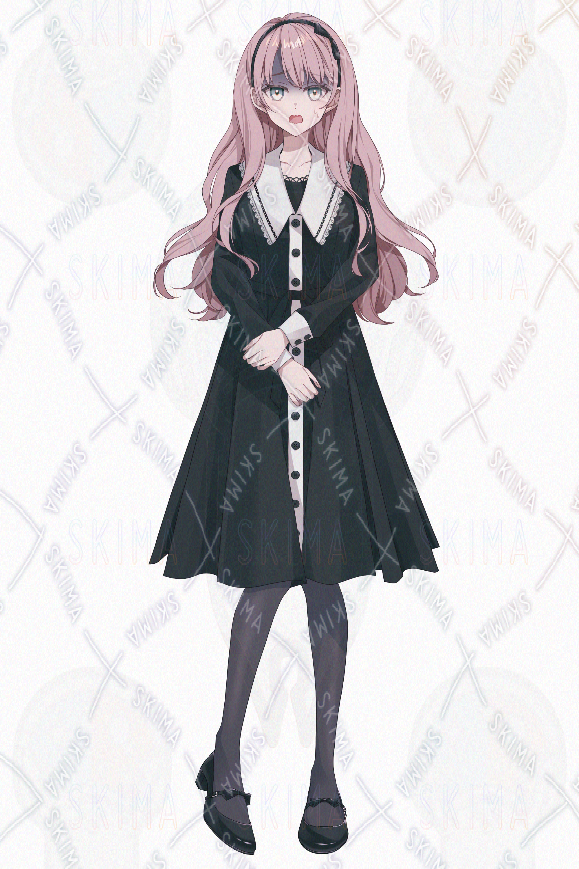 少女、女子、女性、ワンピース、スカート、ファンタジー、お嬢様、令嬢、長髪、ピンク髪、カチューシャ、黒