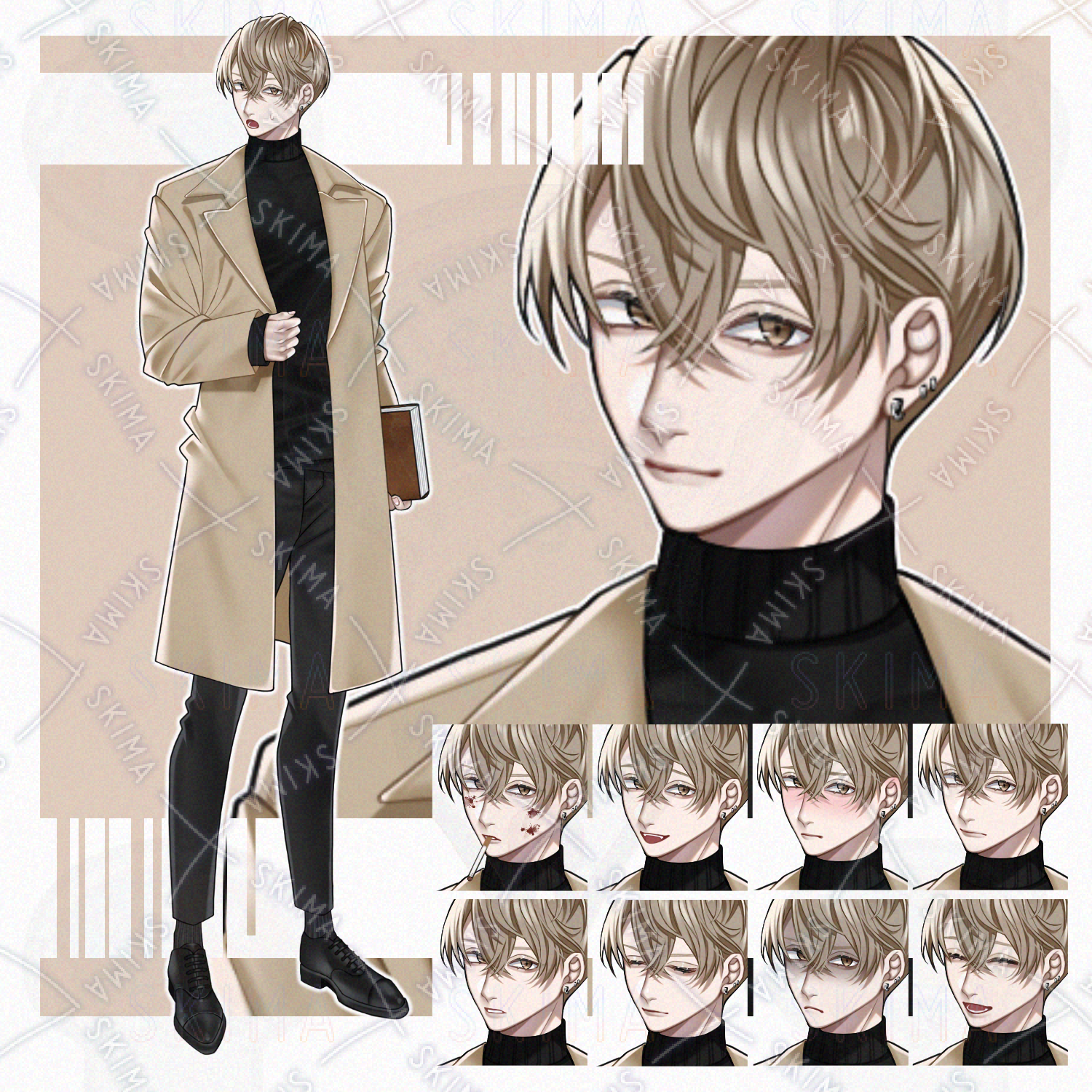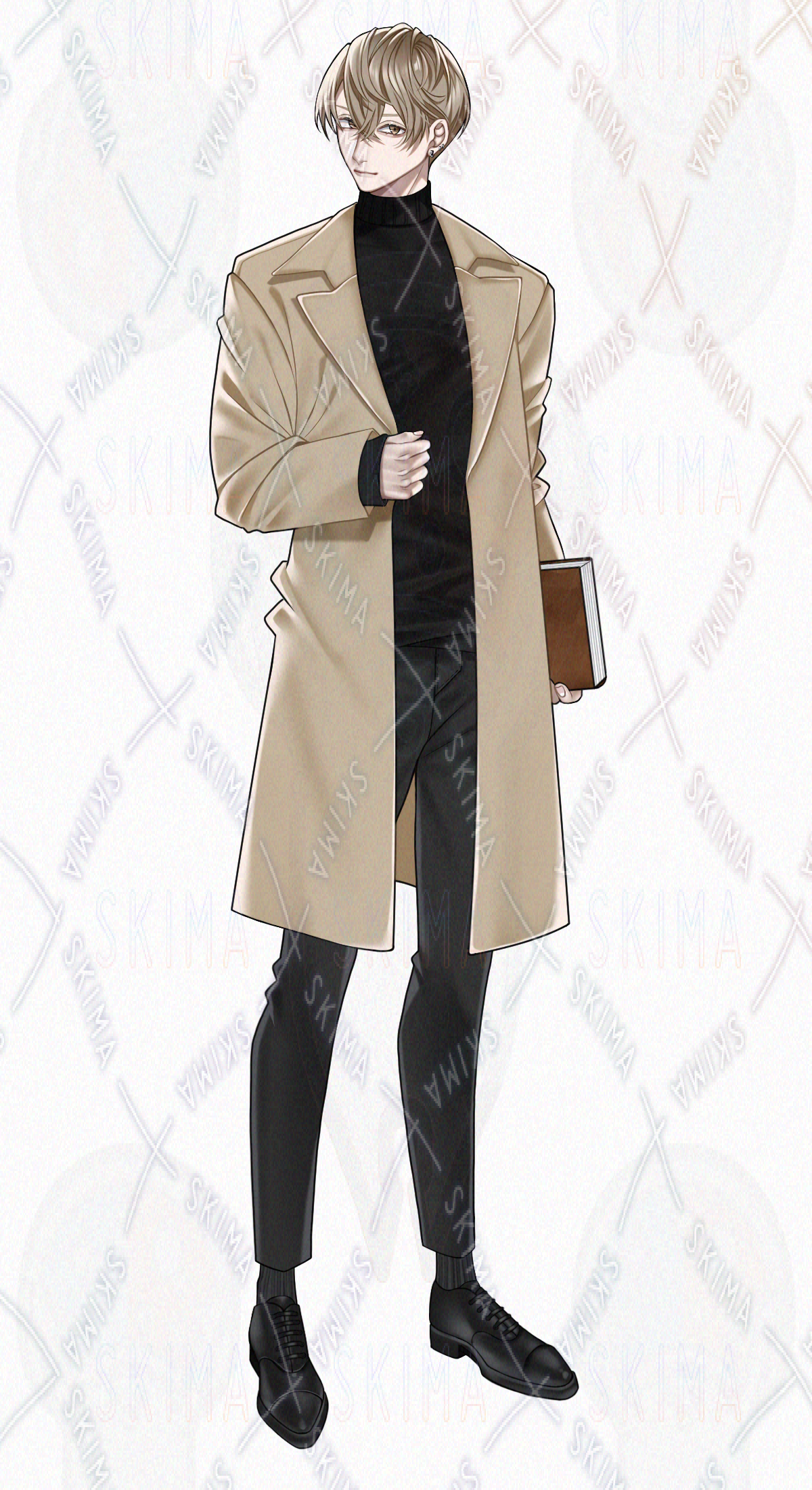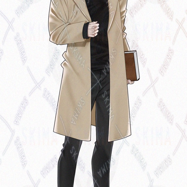 男性/男の子/男性キャラクター/立ち絵/茶髪/金髪/ロングコート/TRPG/全身/短髪/ピアス/ニット/お兄さん/煙草/本