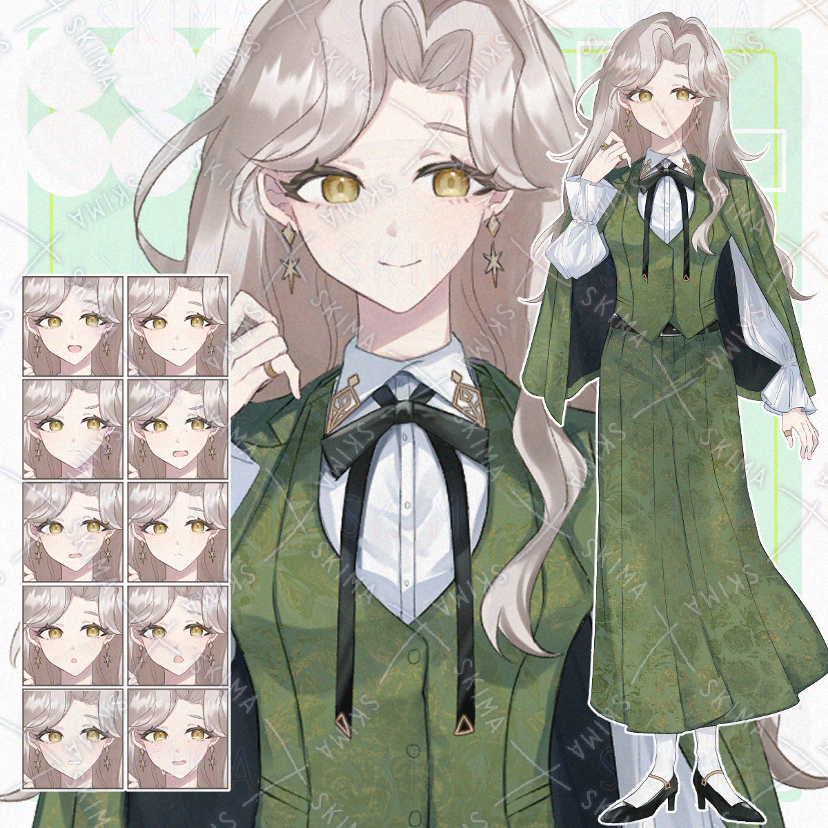 おっとり系ウェーブ髪のグリーンの三つ揃えスーツを着た女性の立ち絵です。