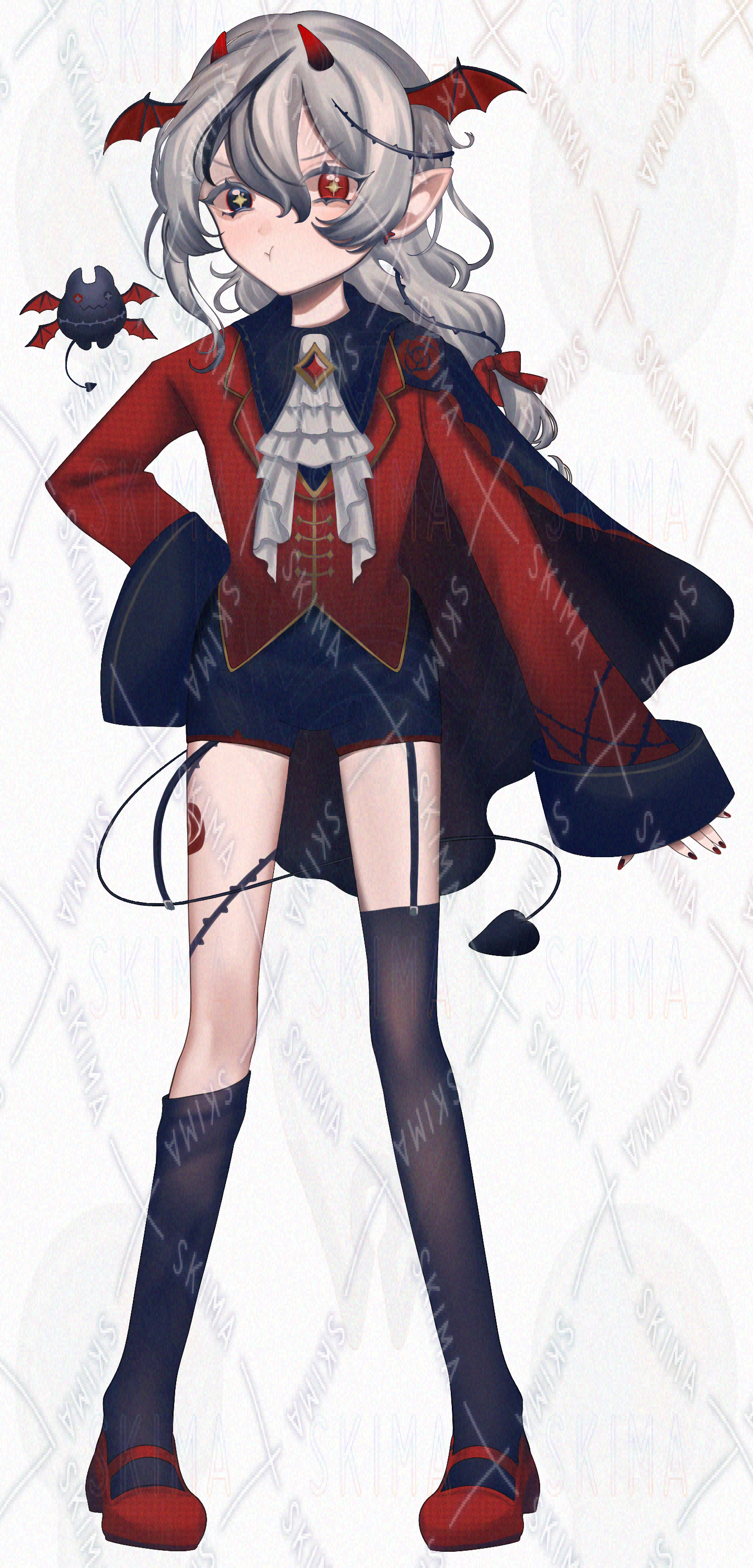 グレーのメッシュ・オッドアイの薔薇モチーフの悪魔とおともの立ち絵です。