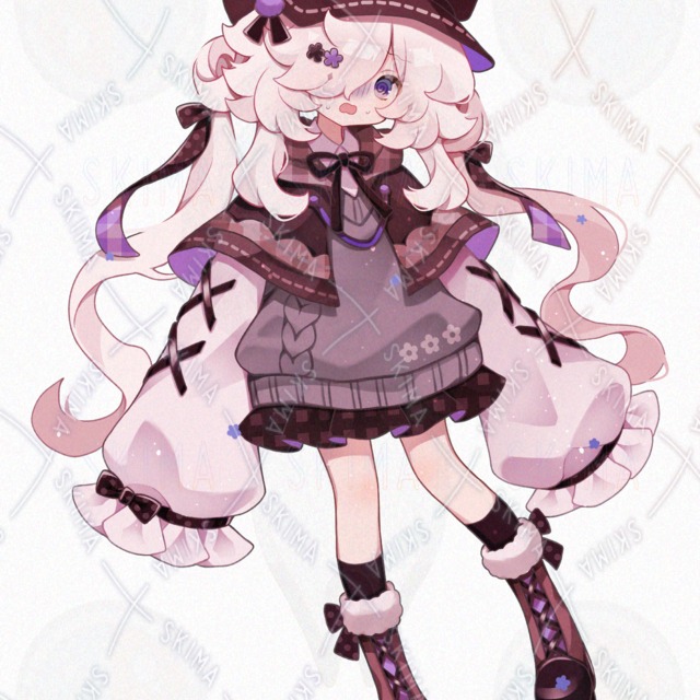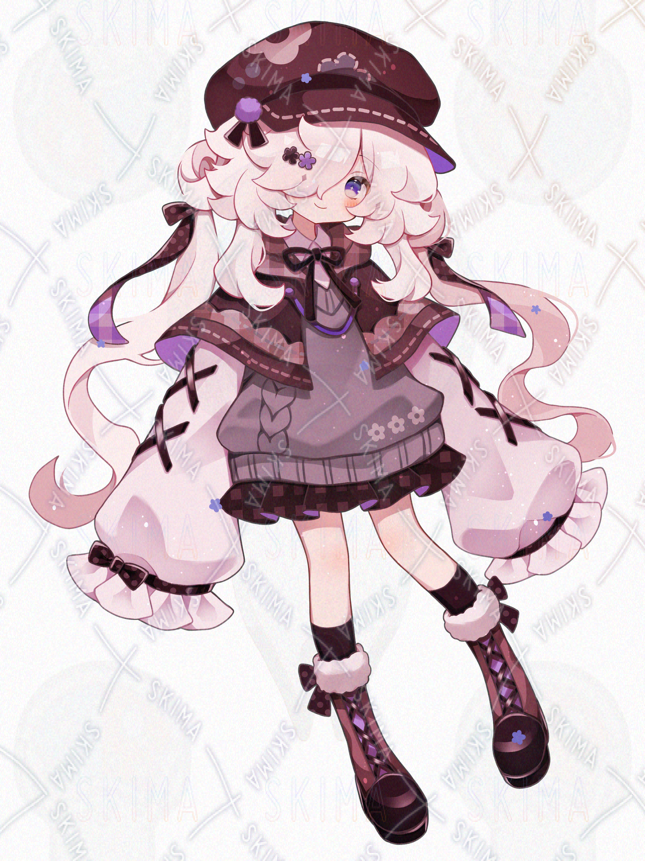 かわいい/美少女/女の子/メカクレ/隠れ目/ゆるふわ/リボン/ロングヘア/花/スカート/紫/帽子/キラキラ/もこもこ/ポンチョ/