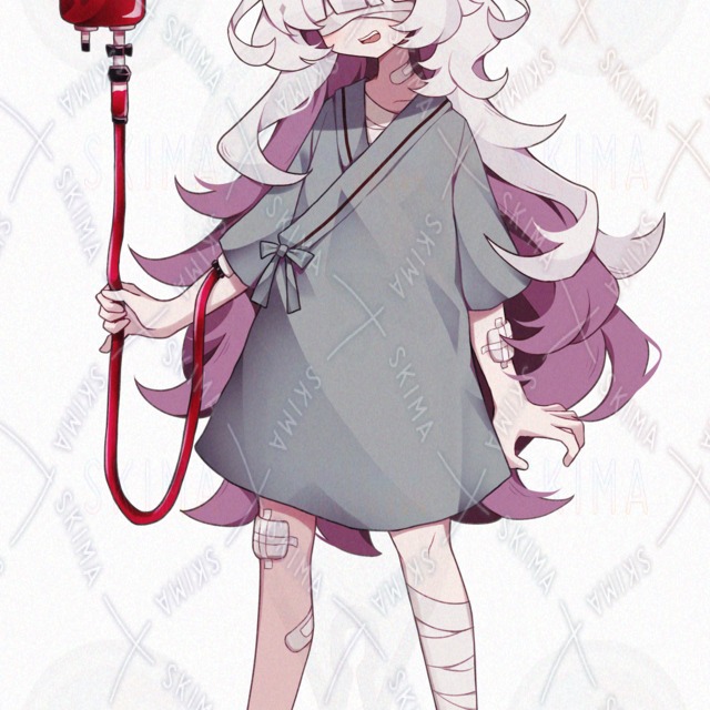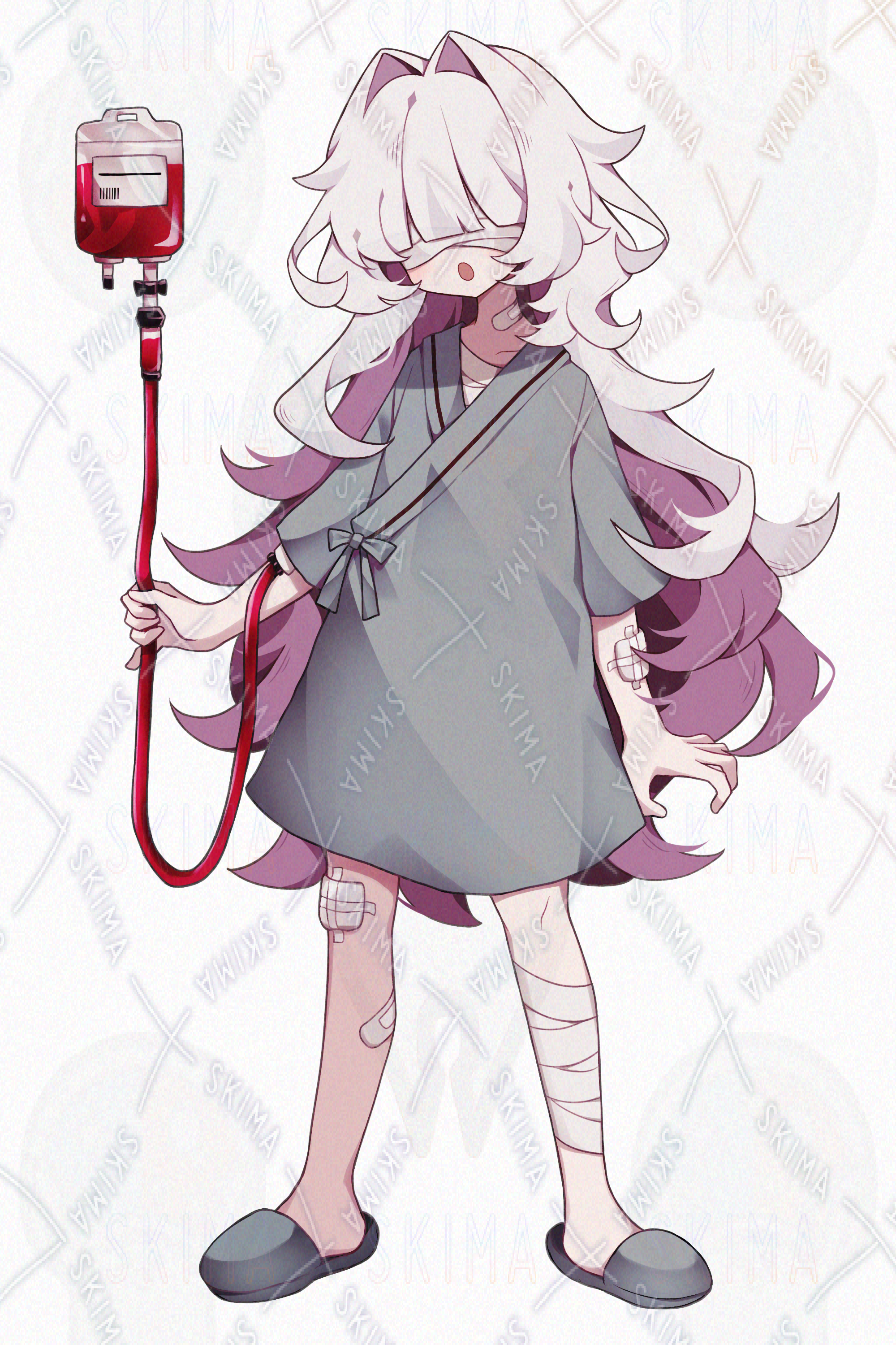 かわいい/女の子/美少女/中性的/メカクレ/白髪/隠れ目/患者衣/病院/入院/血液パック/包帯/絆創膏/スリッパ