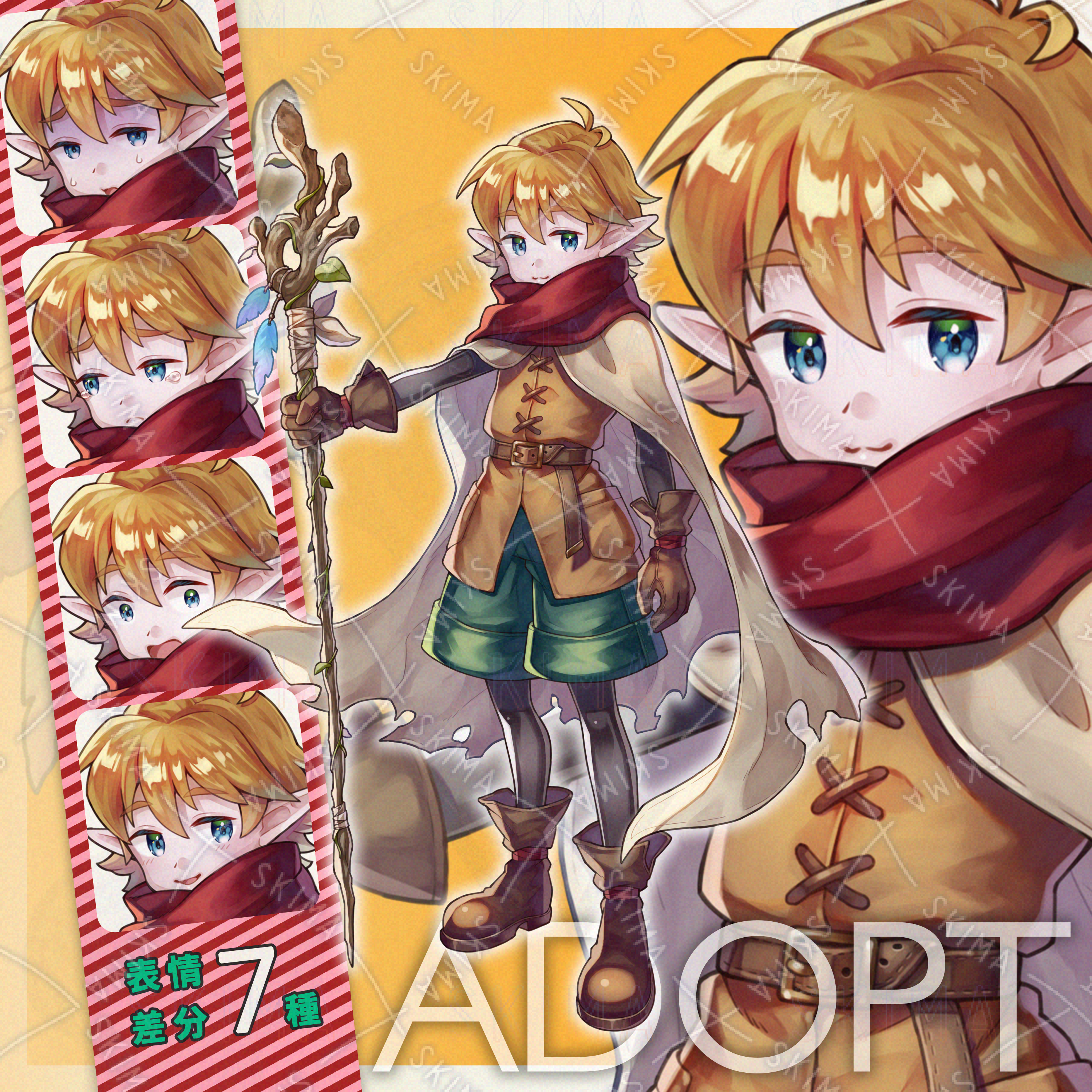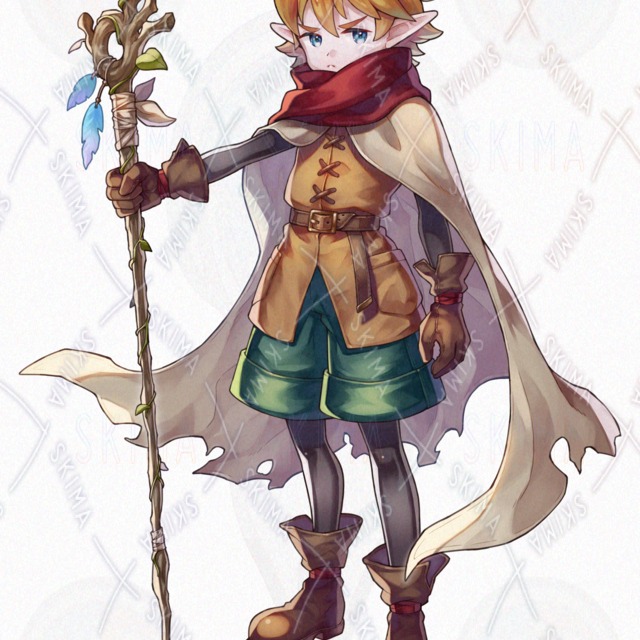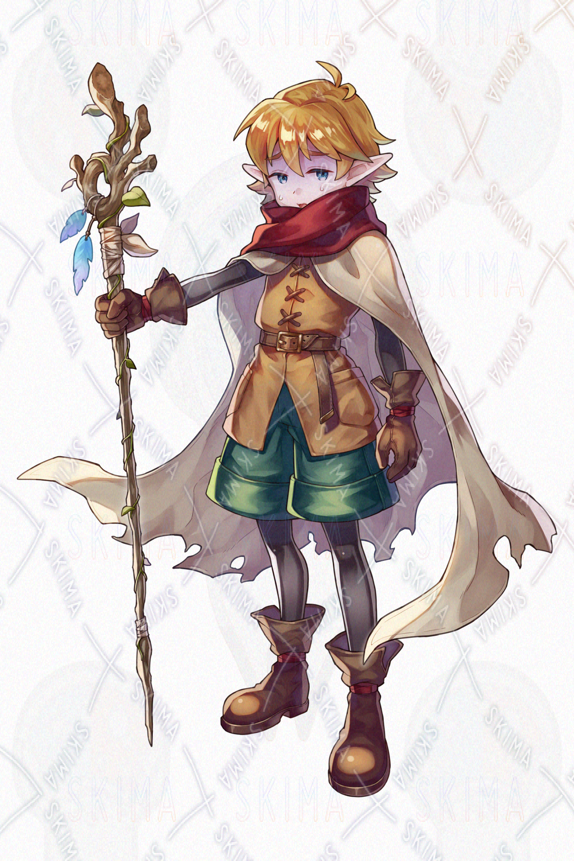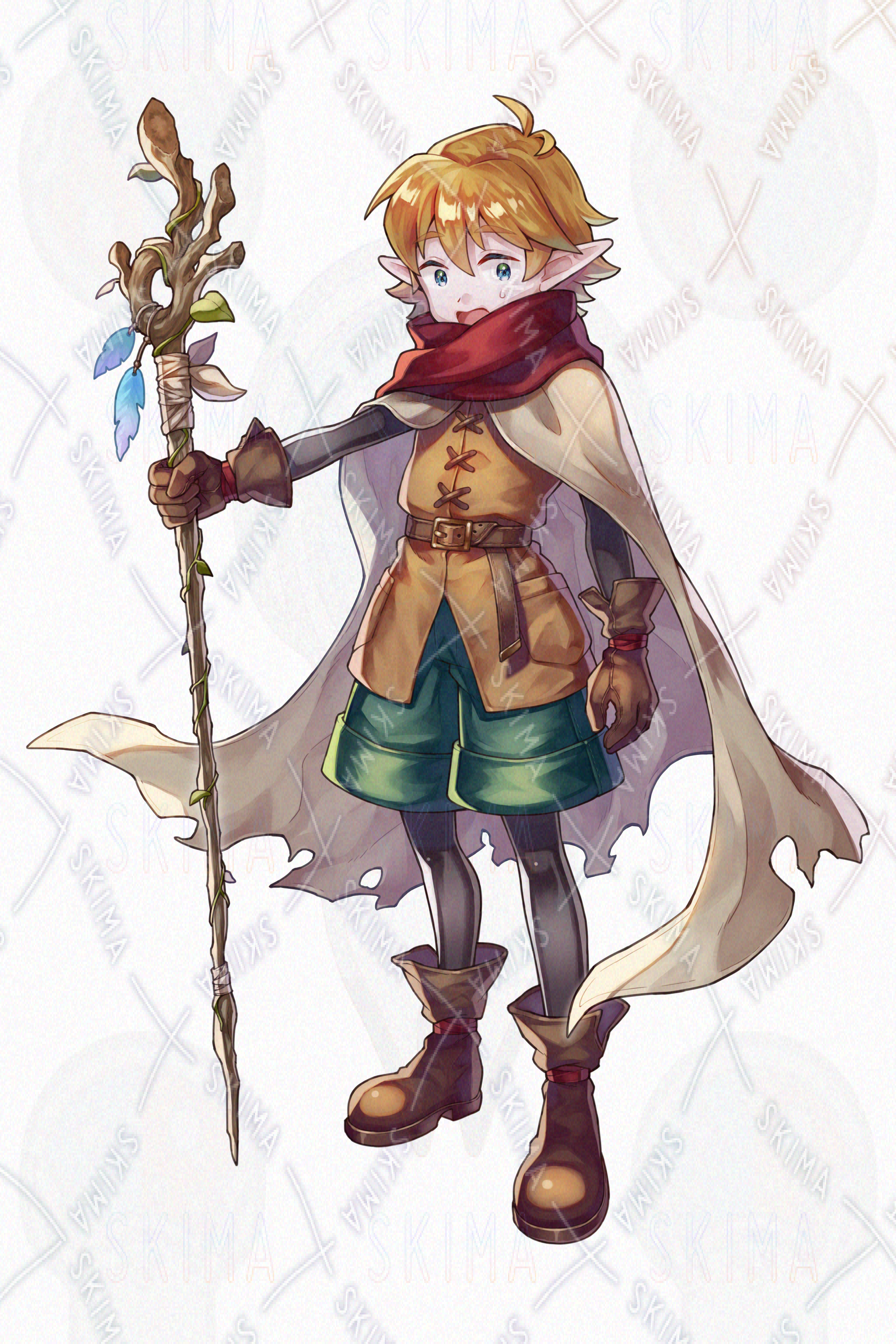 男の子/少年/エルフ/魔法使い/冒険者/金髪/青眼/マント/杖/ファンタジー