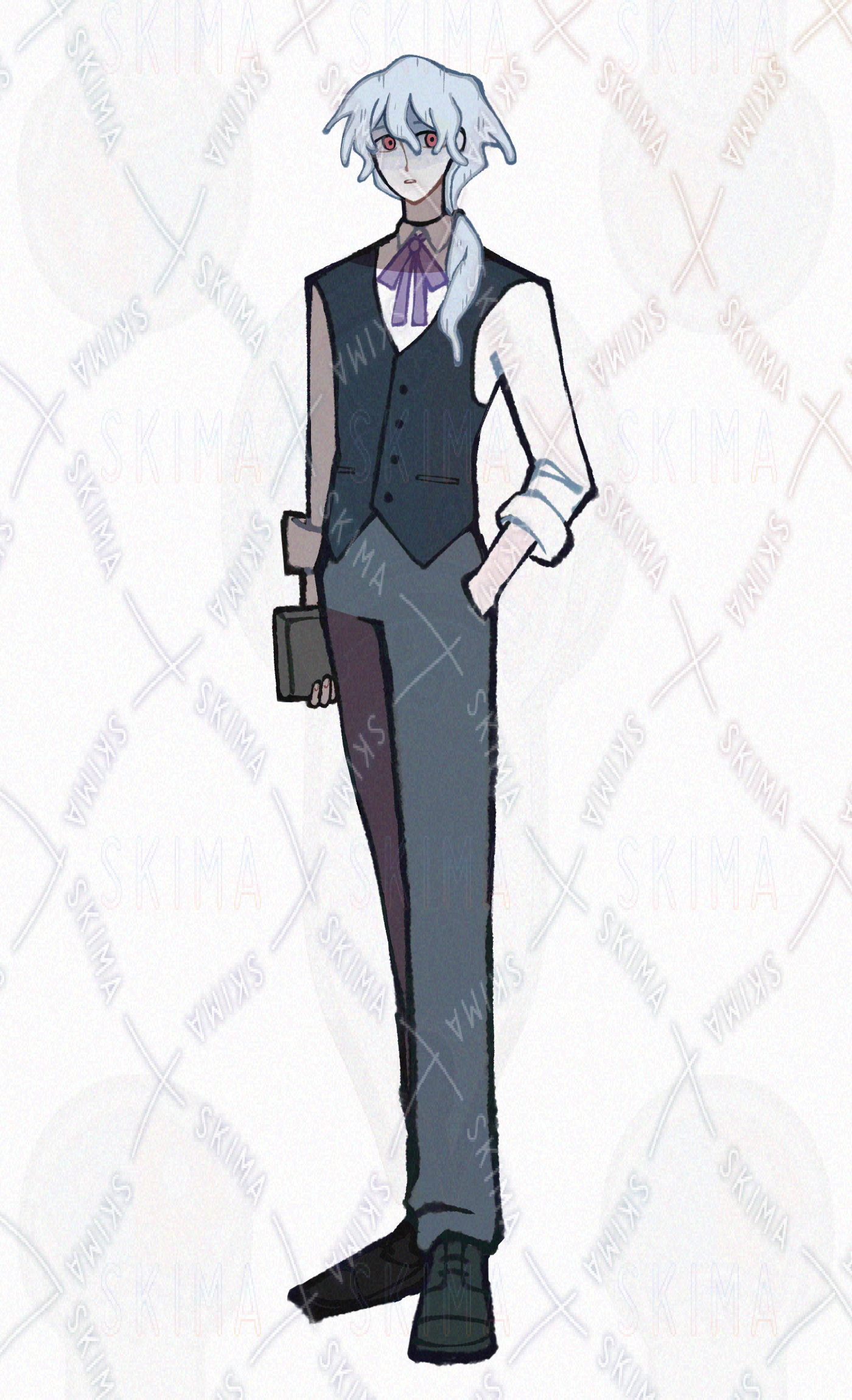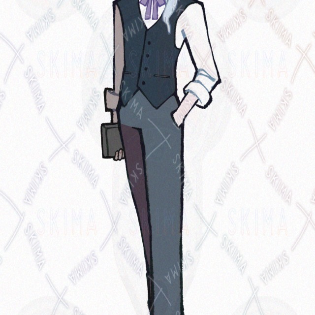 スーツベストを着た青髪の男性です。