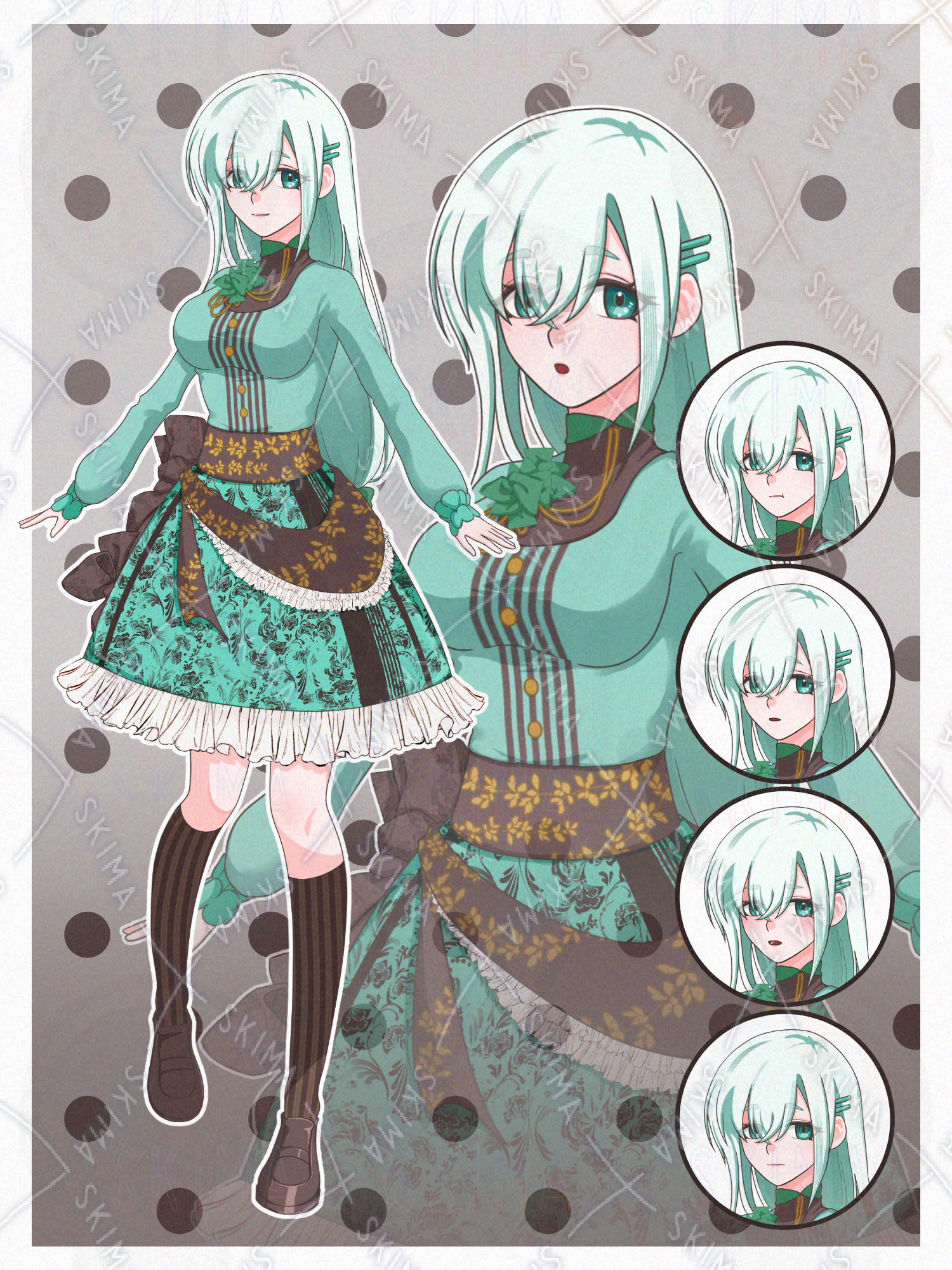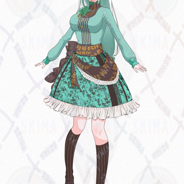 チョコ、ミント、グリーン、緑、ブラウン、茶色、ロングヘア、フリル、リボン、スカート、ヘアピン