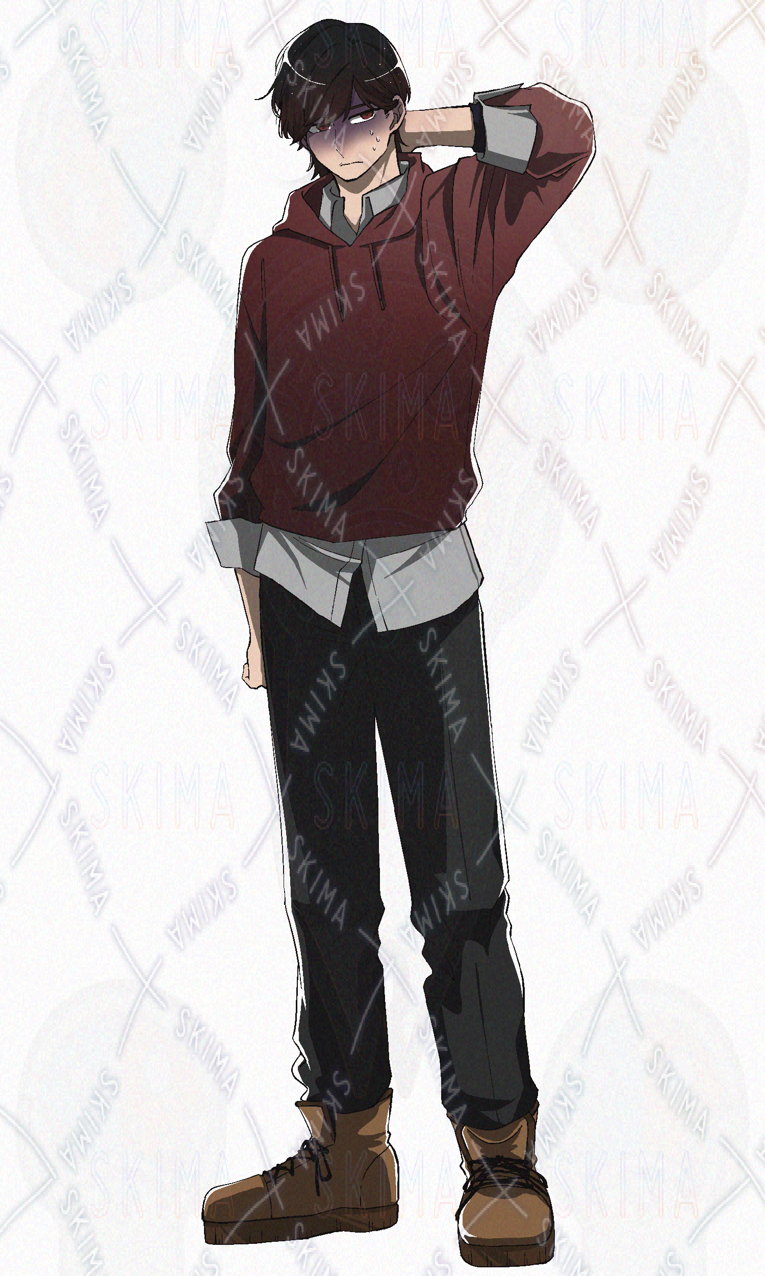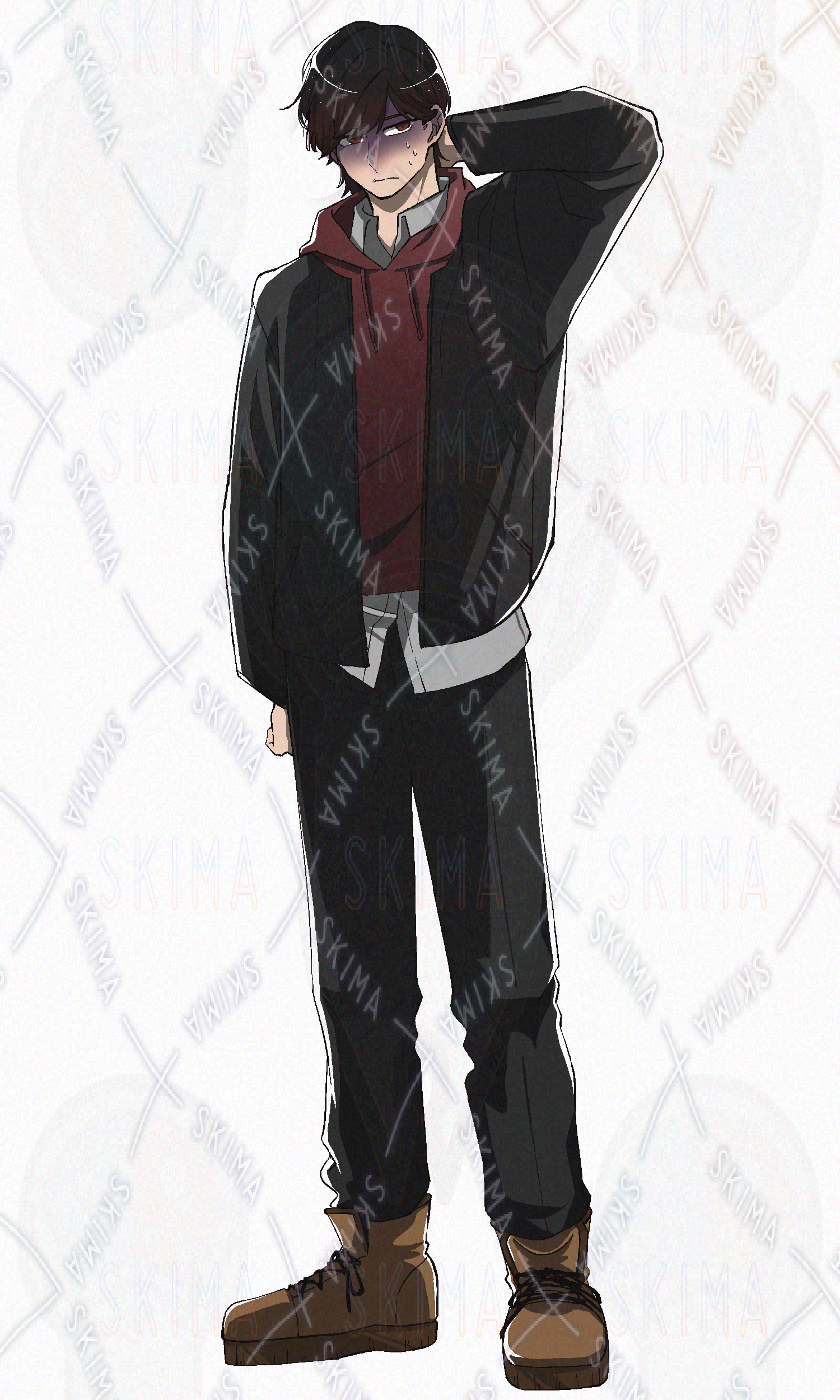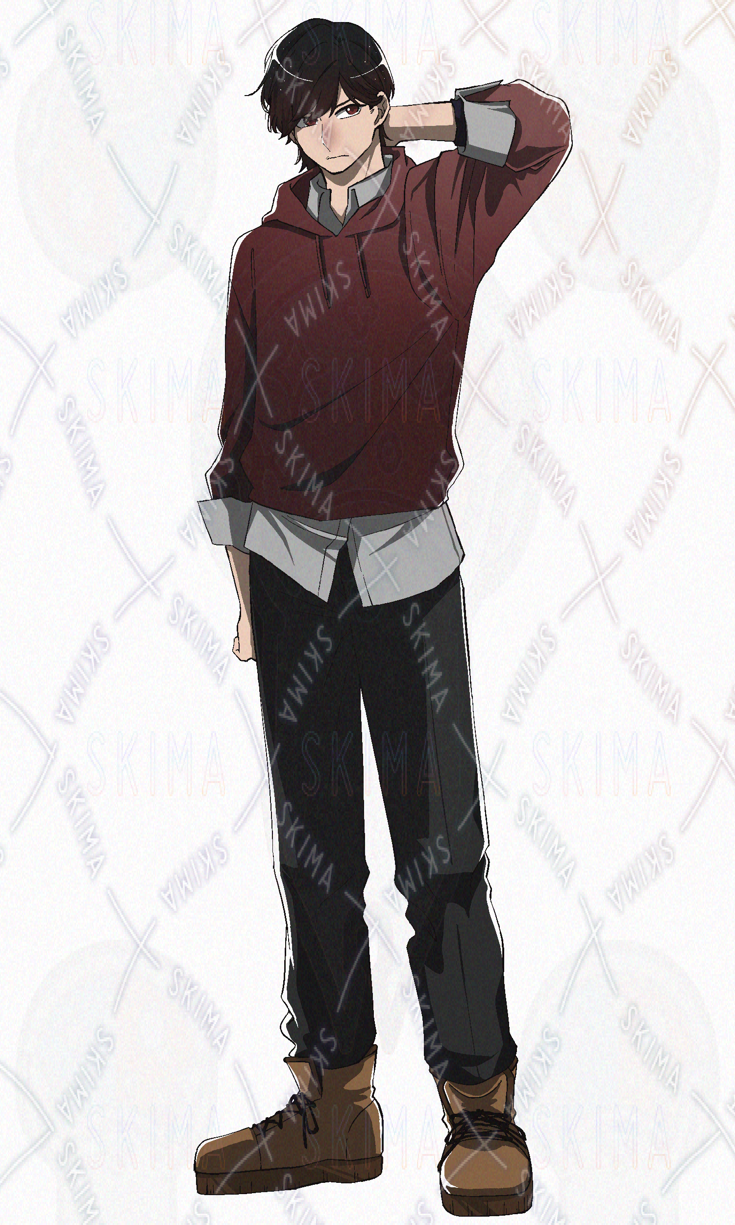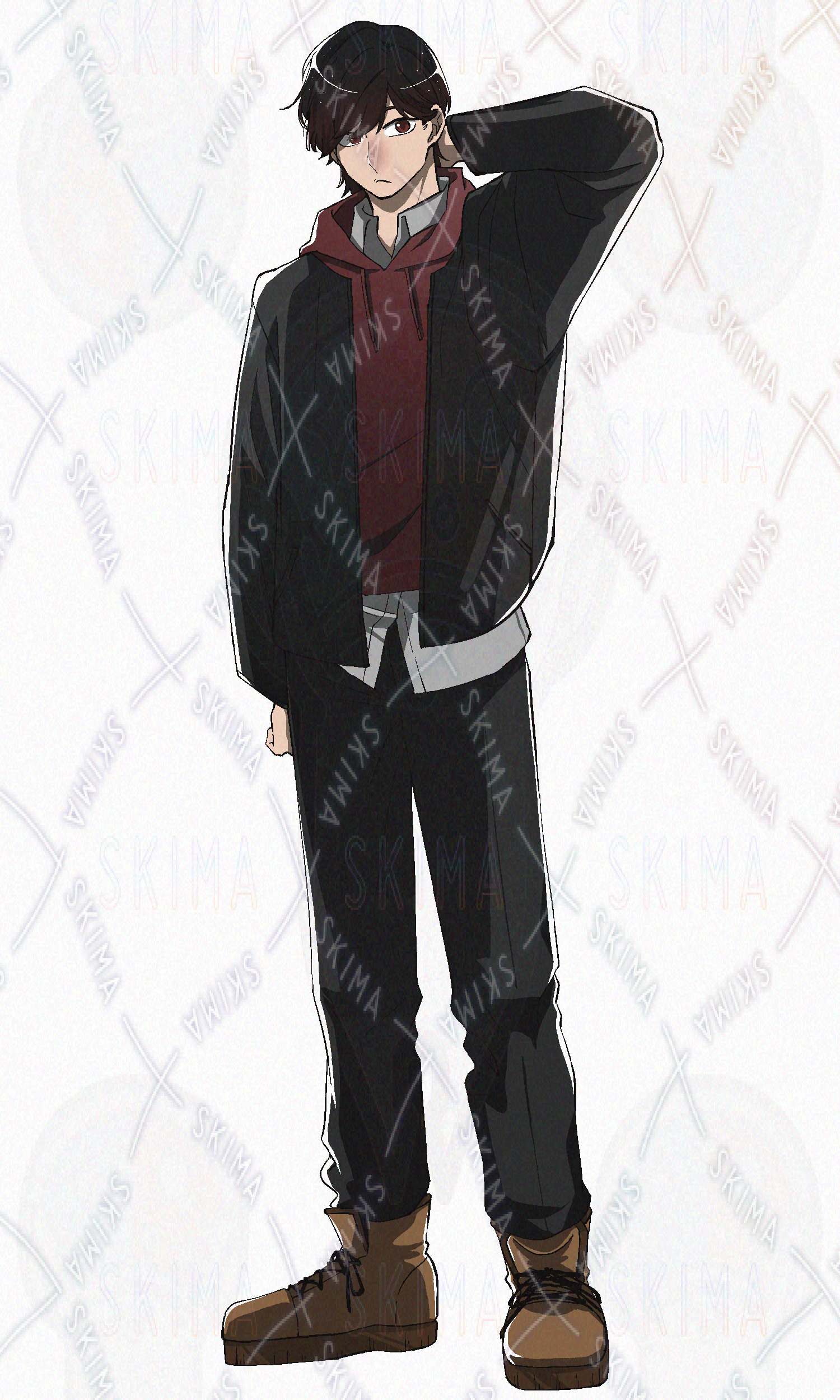 パーカー、アウター、赤パーカー、学生、大学生、青年、男性、男子、暗髪、ブーツ、黒髪