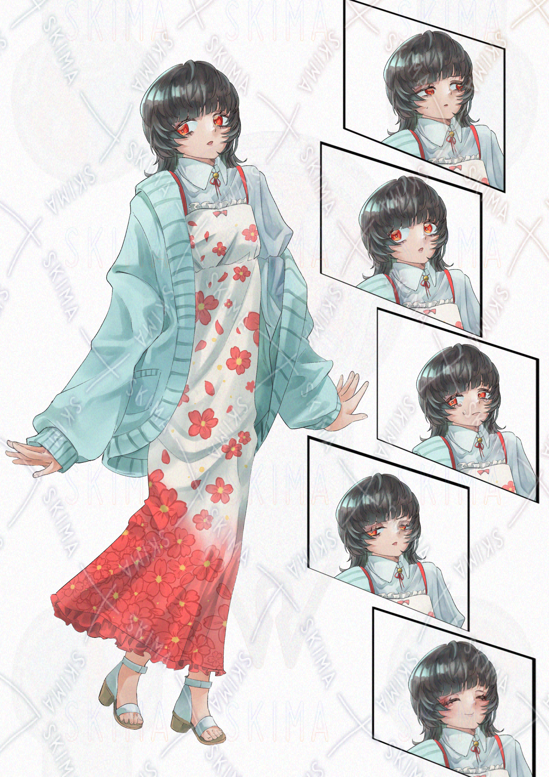 花柄ワンピースを着た長身なキャラの全身立ち絵です。通常表情の他、笑顔、泣き顔、驚き顔、怒り顔、困惑顔があります。