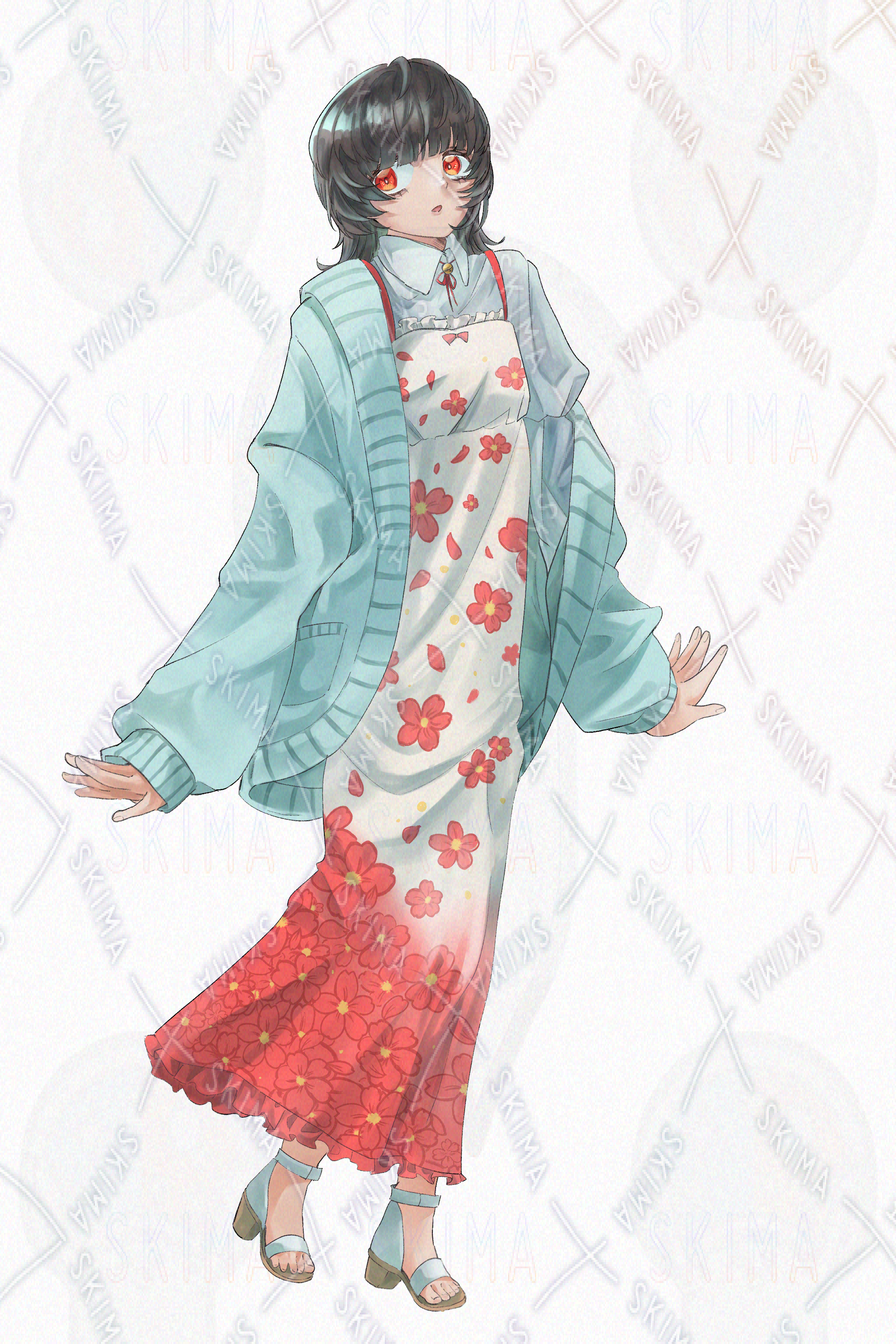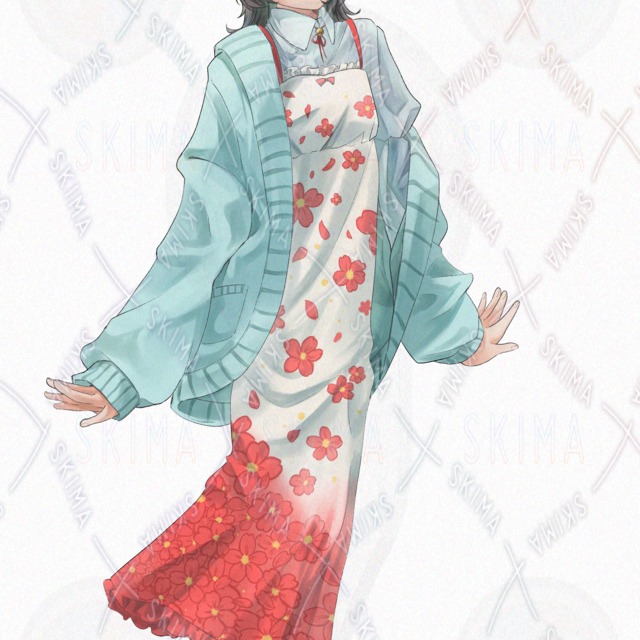 This is a full-body standing illustration of a tall character wearing a floral-patterned one-piece dress.