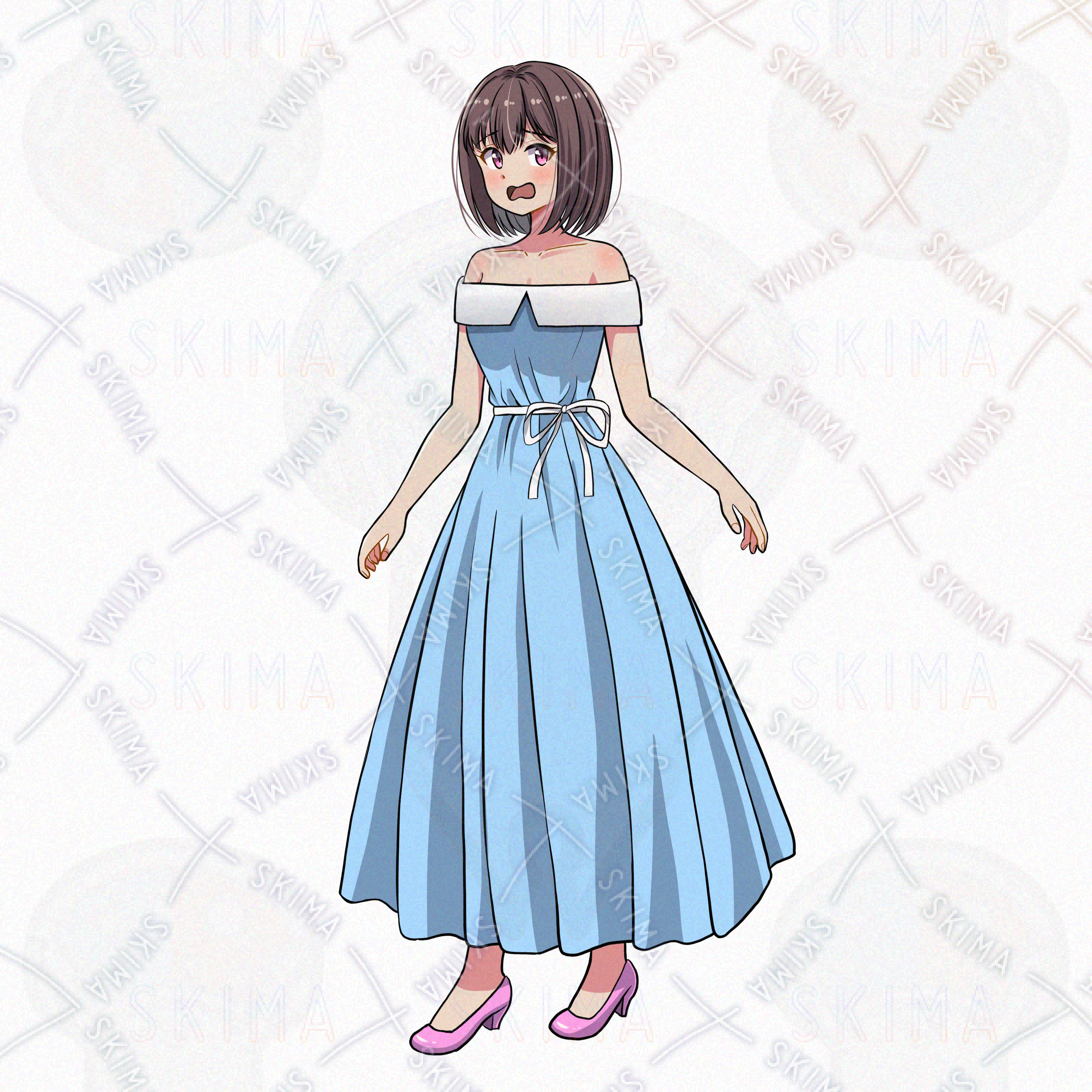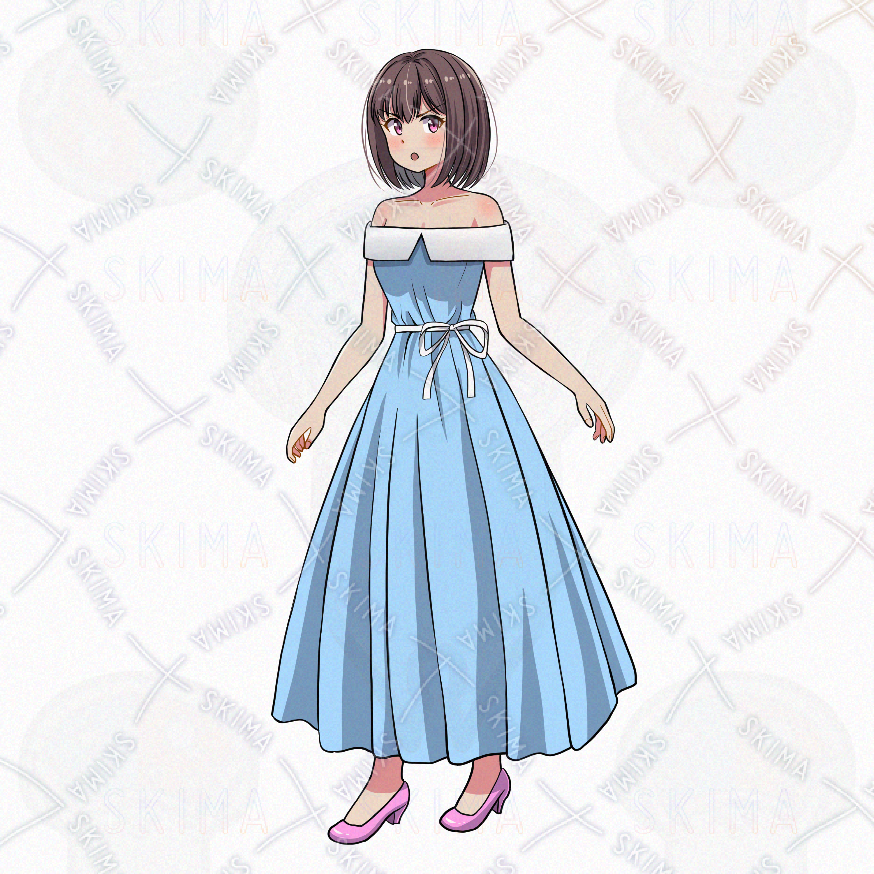 肩だしワンピースを着た女子のイラストです。