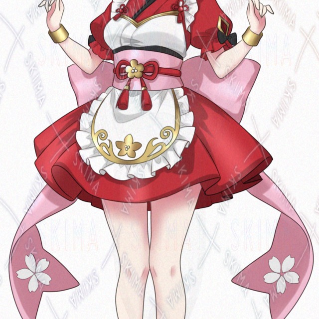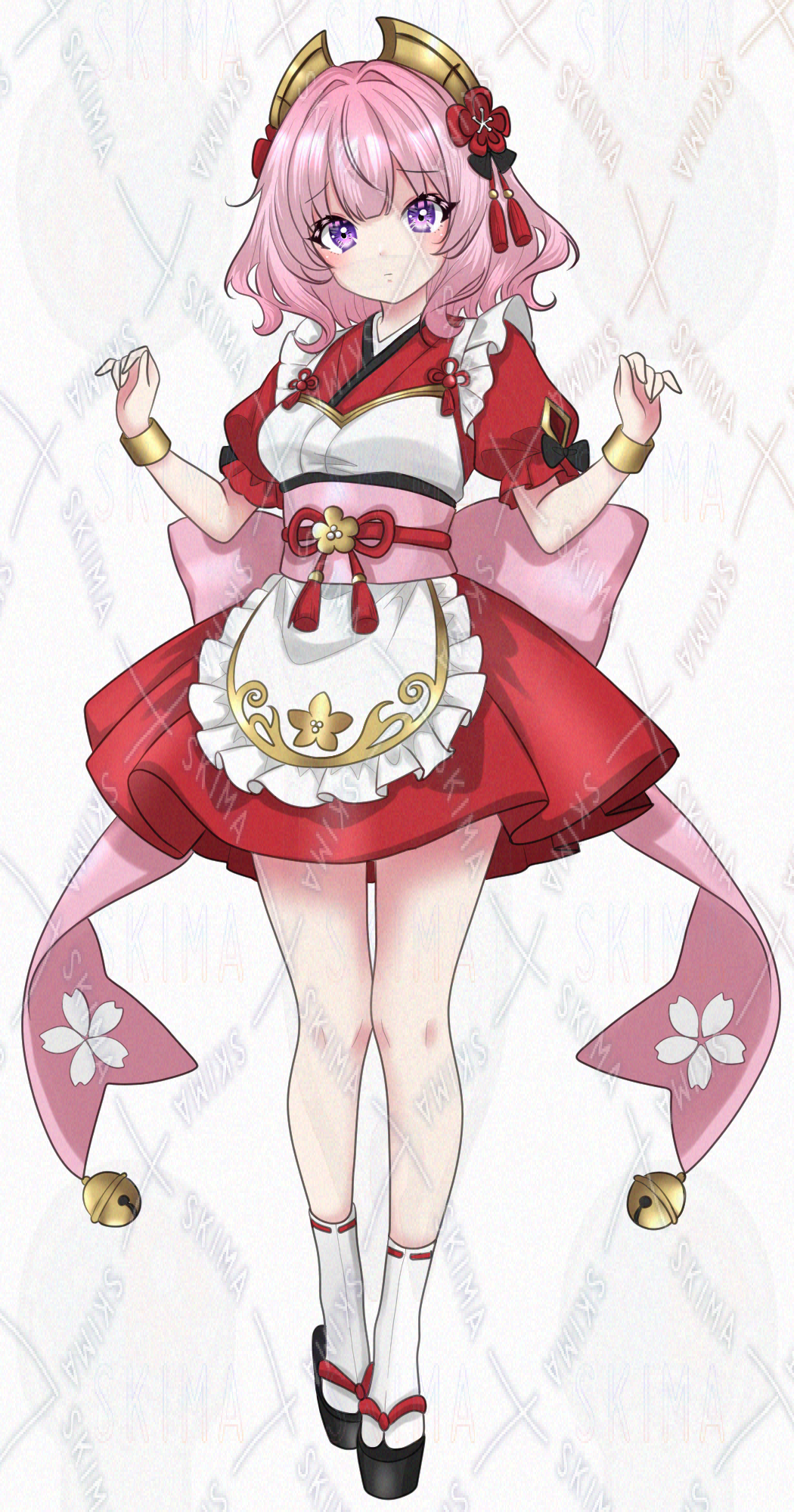 和モダンな巫女服風ウェイトレス衣装を着た、ピンク髪ゆるふわウェーブの女の子の立ち絵です。