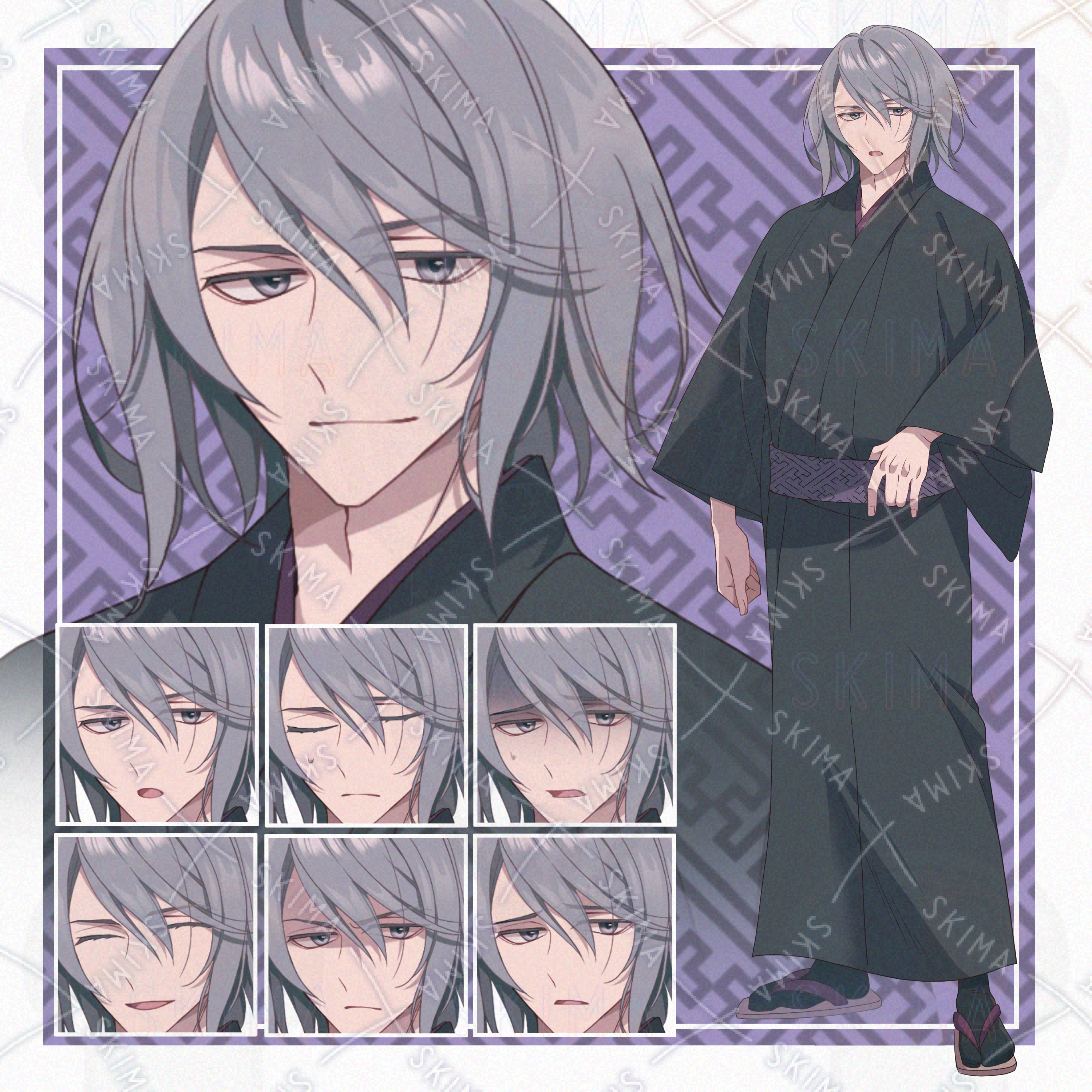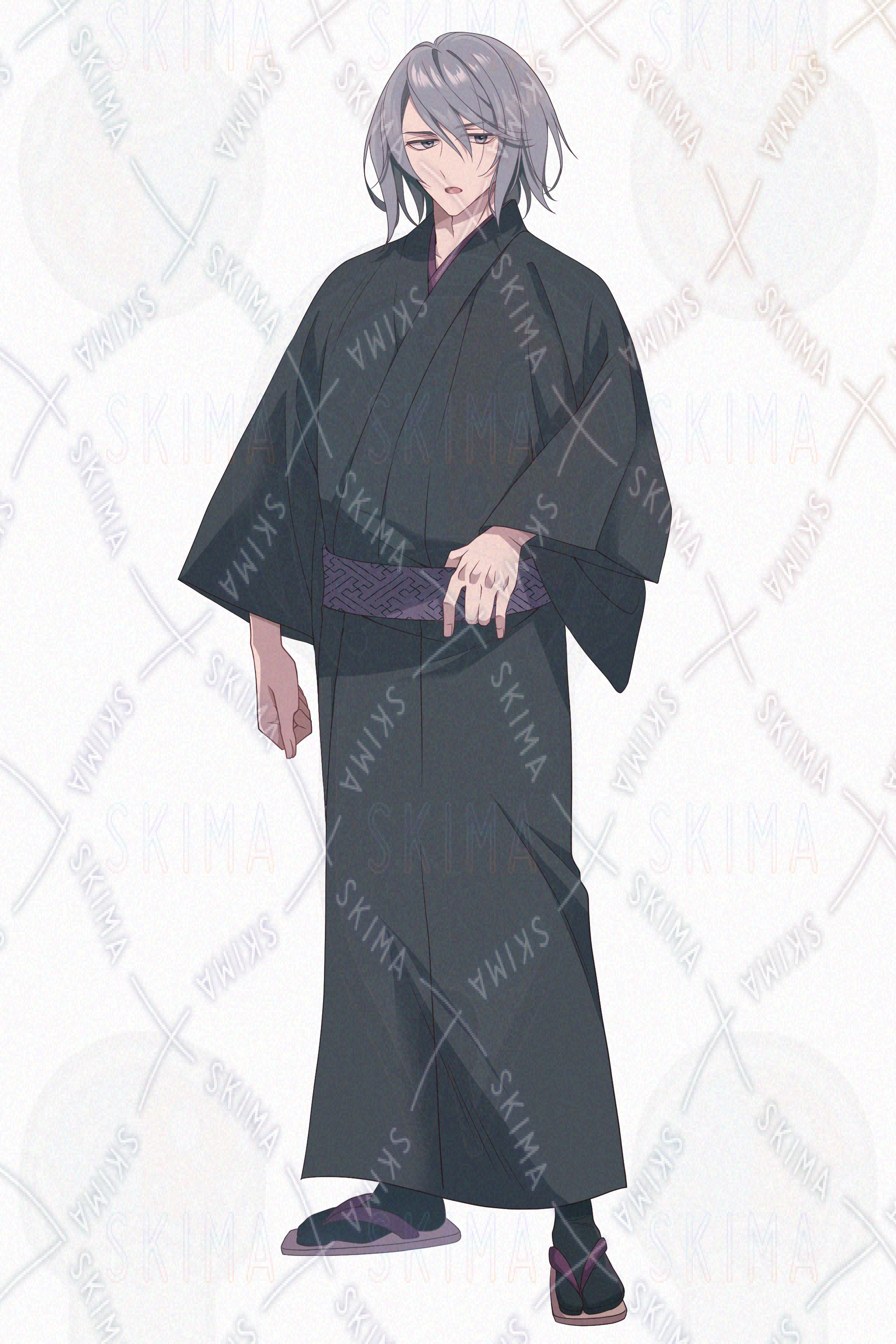 和、和風、男性、草履、長髪、青年、着流し、和服、銀髪、タレ目、若旦那