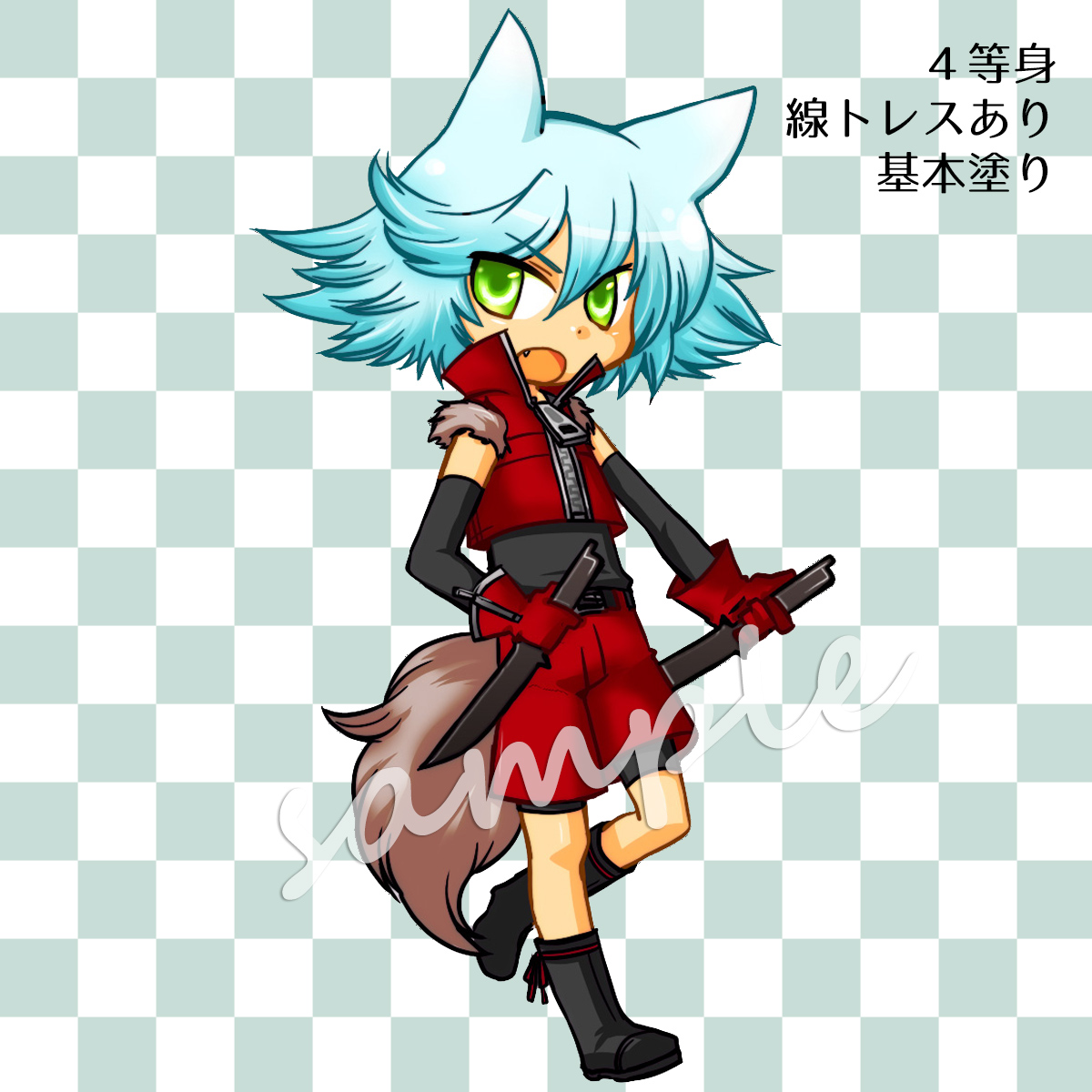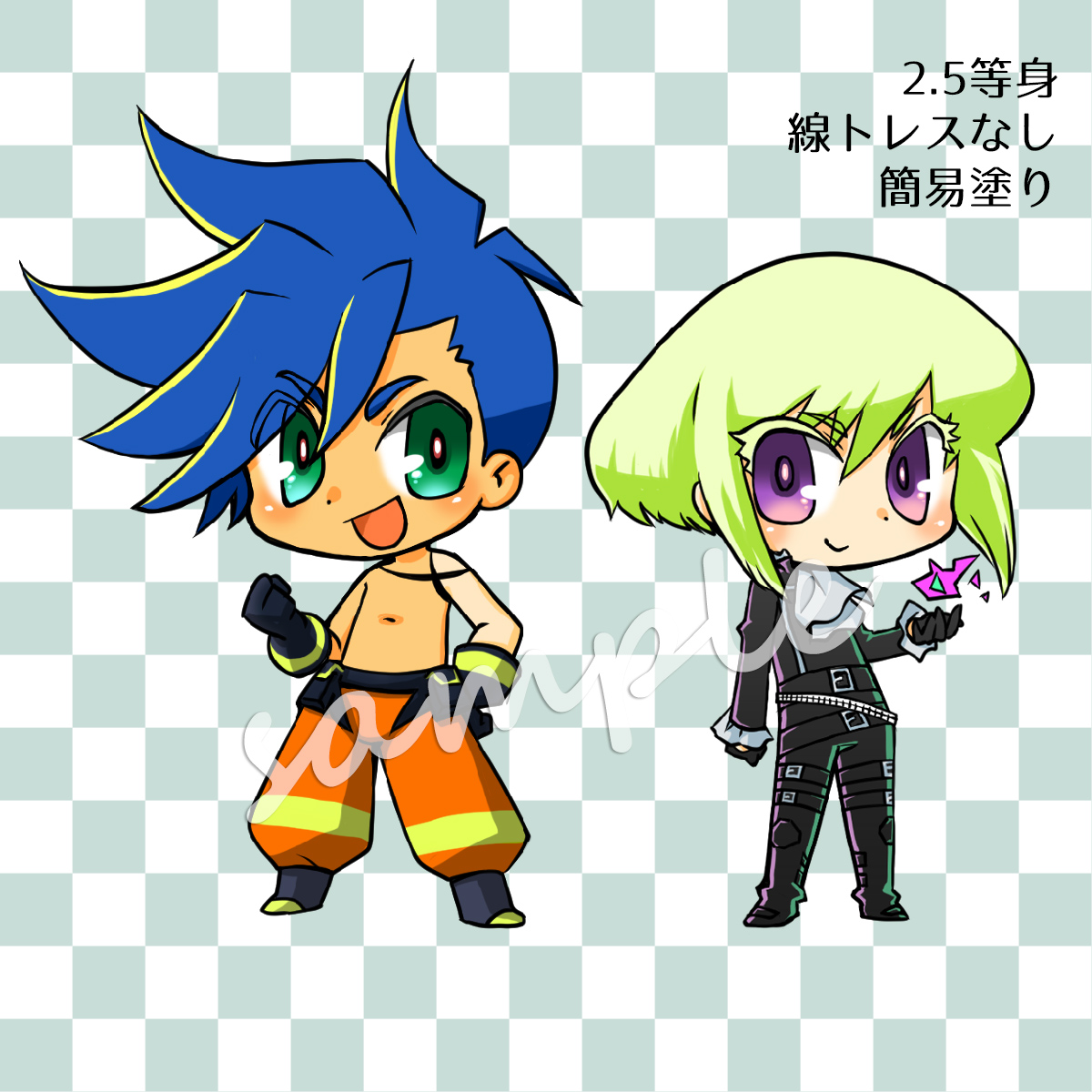 スタンダードな作画です。主線ペン入れ、デジタル塗り、5等身以下。 背景はパターン、塗りつぶし、透過、デザイン等ご相談承ります。 表情差分も作成可能です。