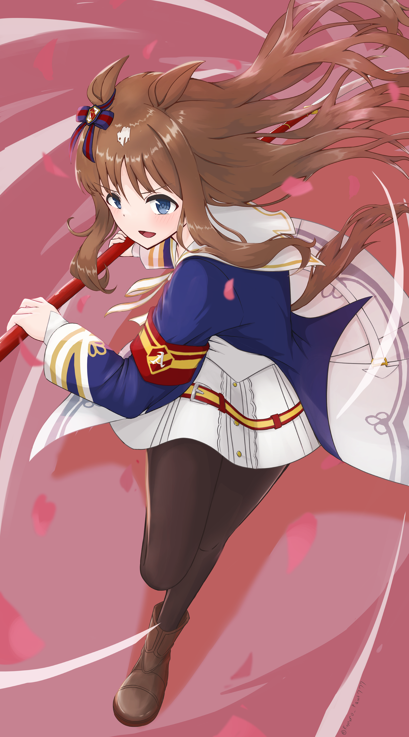 グラスワンダーの固有演出を参考に、薙刀を振るう凛々しい姿を描きました。