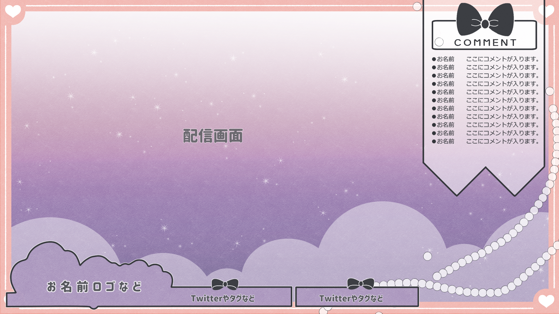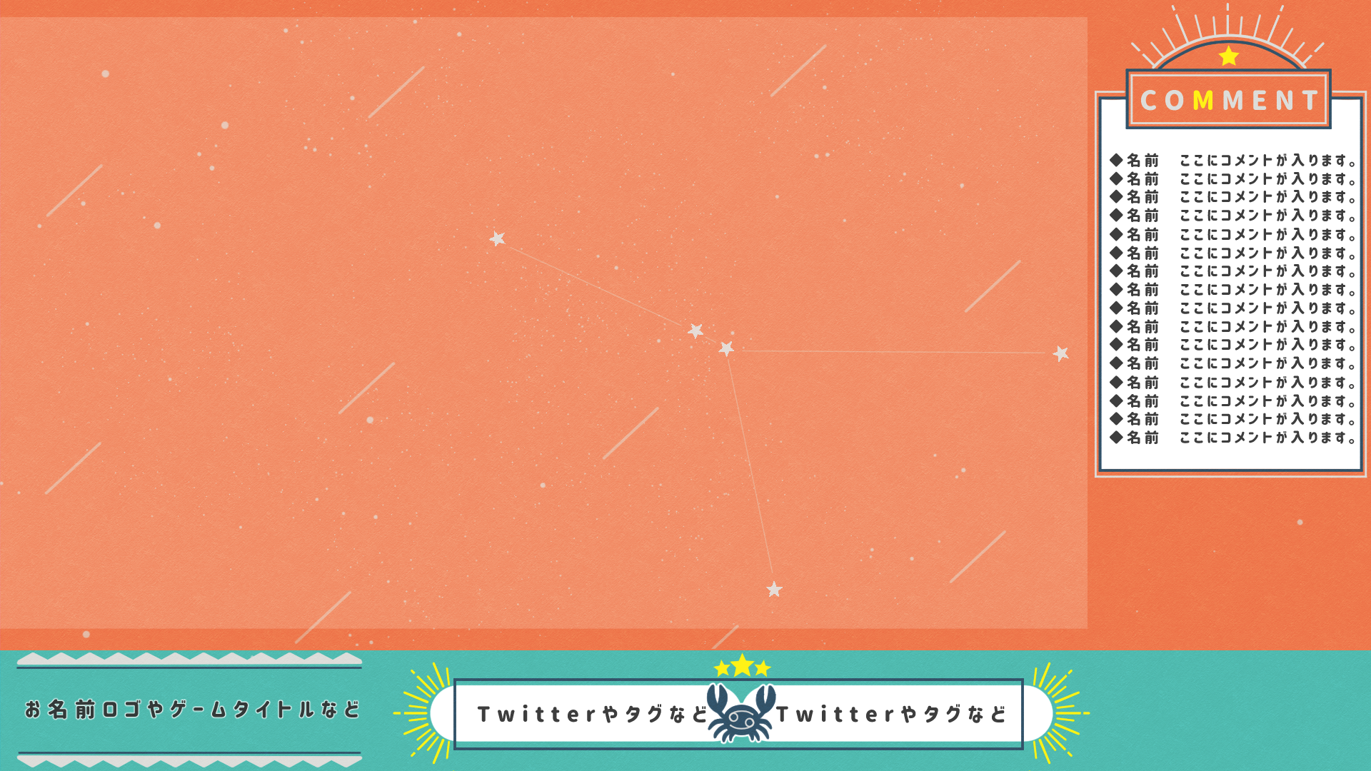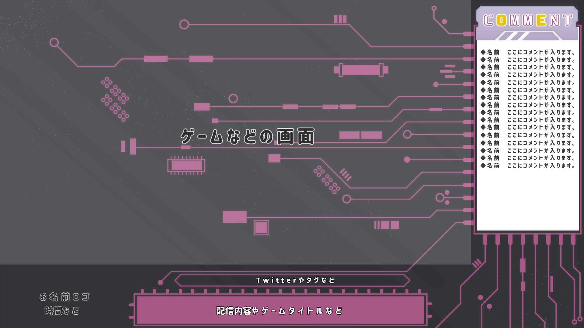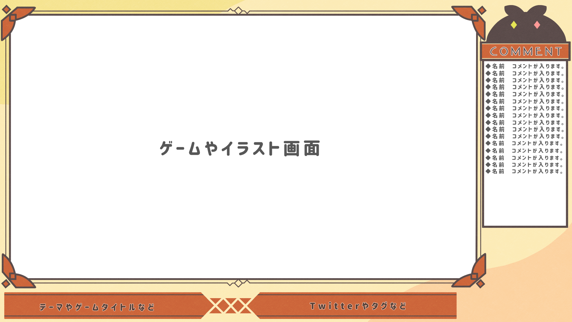 出品している配信画面作成のサンプルになります。 1枚目~4枚目はゲームやお絵かきの配信画面。5枚目は背景のみのご依頼の場合のものになります。