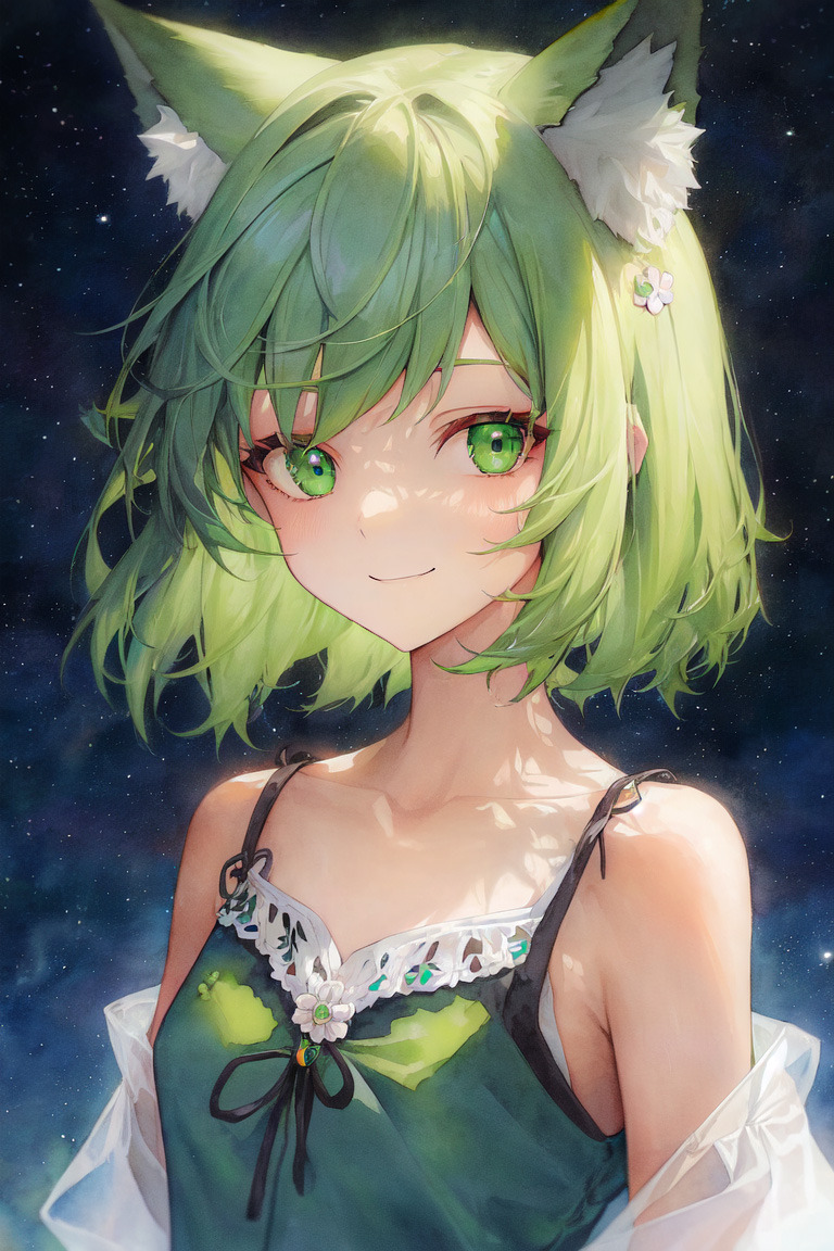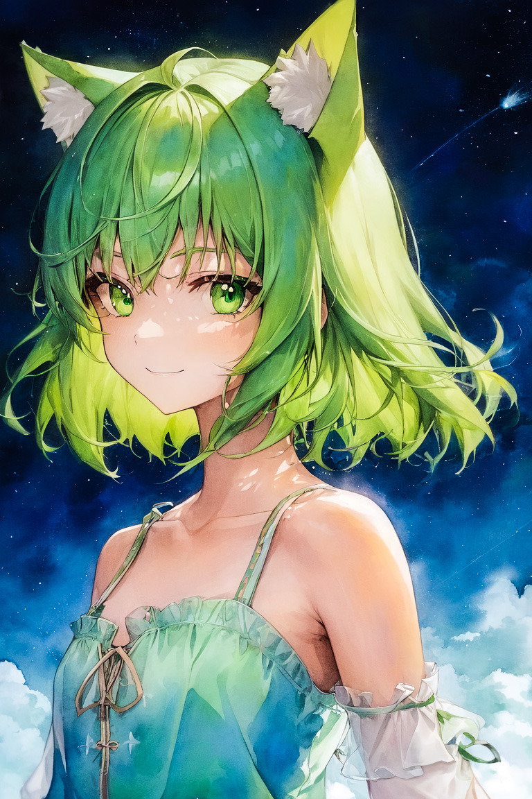 緑の髪が美しいネコ耳の少女を描きました。