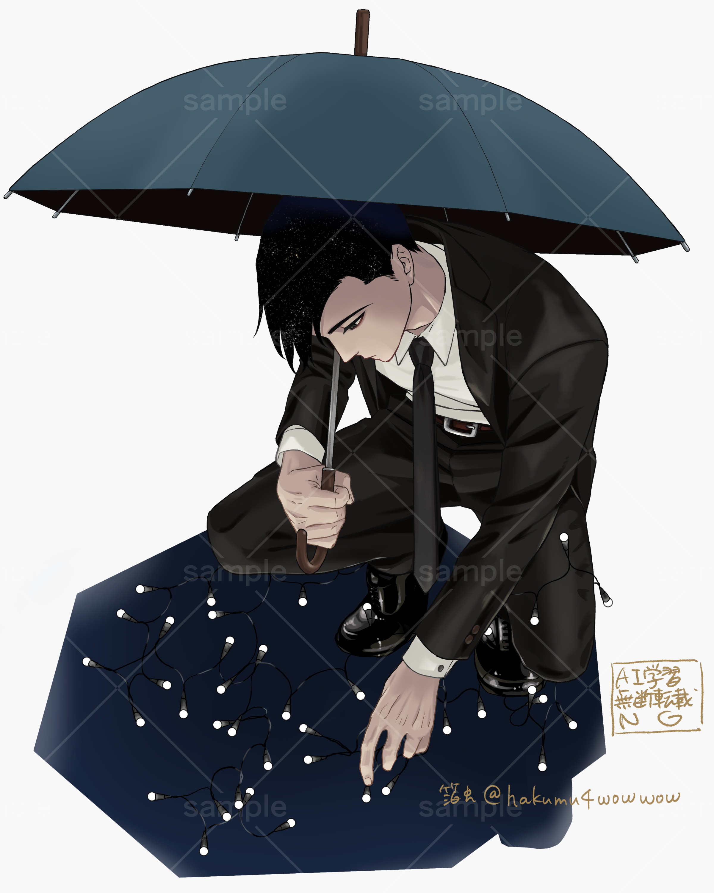 「私の夢は愚かな避難所。雷から身を守るために傘を使うようなものだ」byフェルナンド・ぺソア の、イメージ絵。 電飾はステキ。 もっとシンプルな塗りにしてより二次元を前面に出しても良かったかと今にして思う。 電飾は…ステキ…(二度目)。