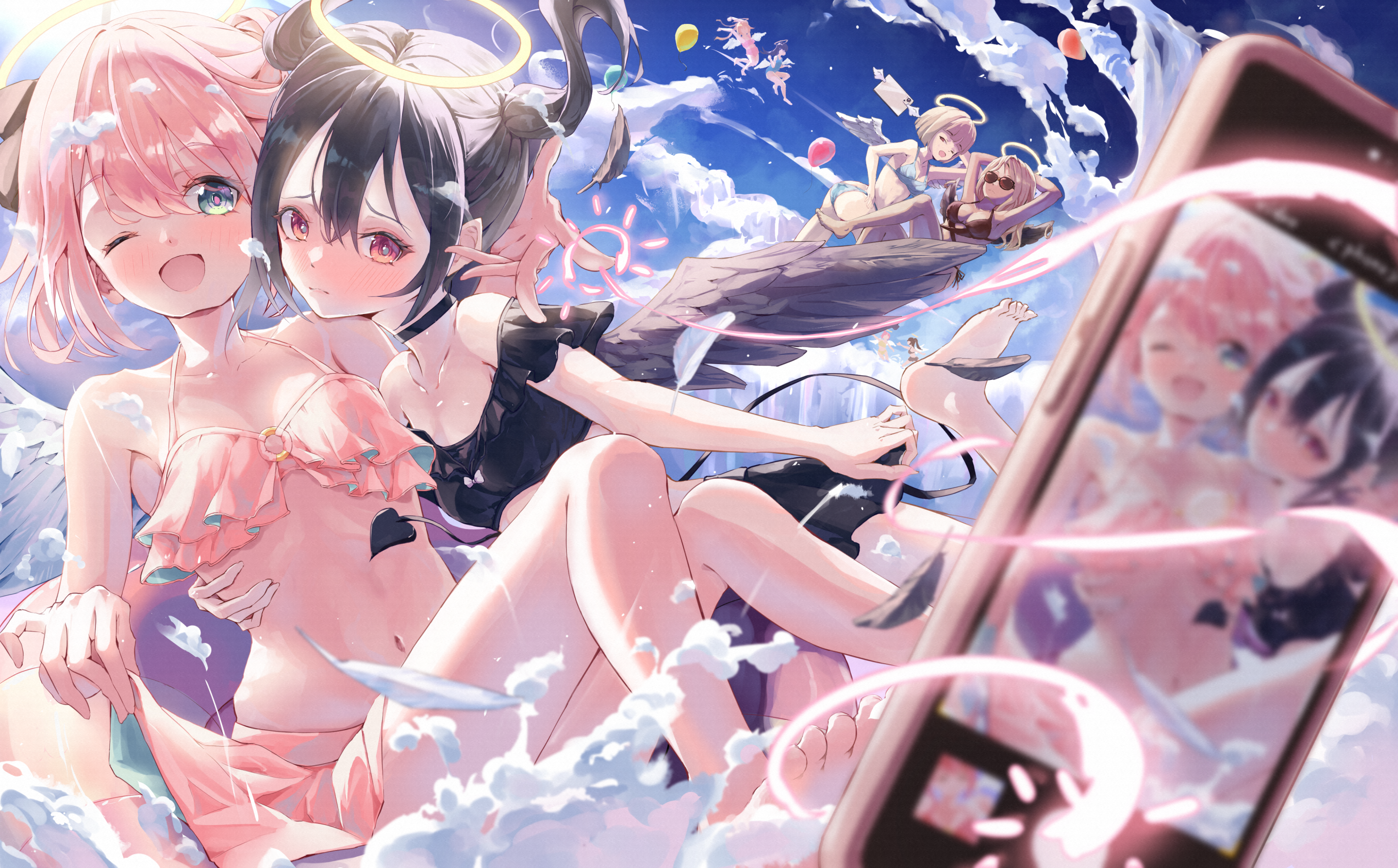 地上の水着に憧れる天使たちが雲を海代わりに水着で遊ぶ夏の思い出を描いた1枚です。