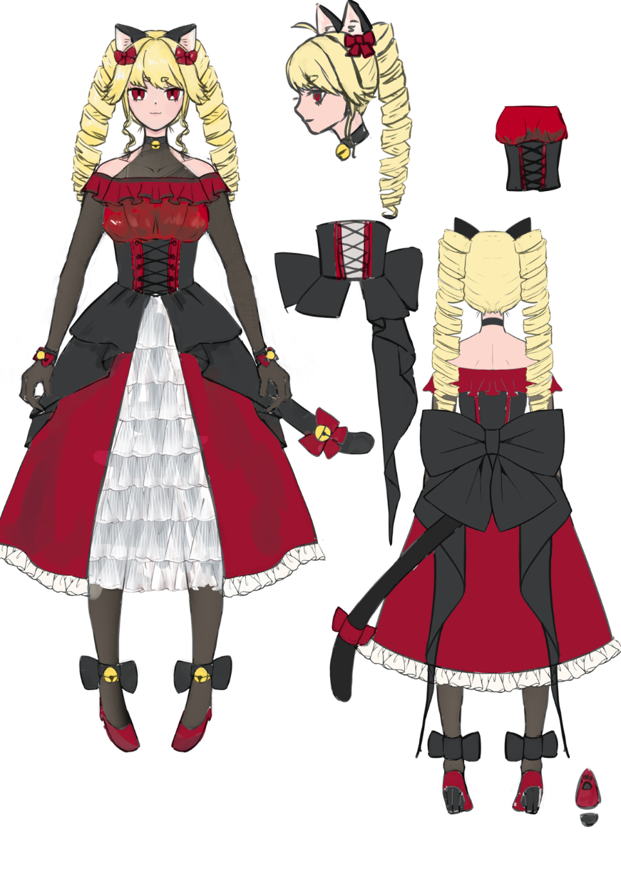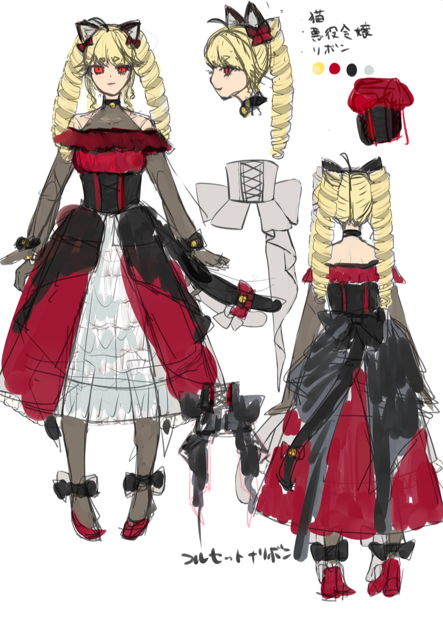 猫✖️悪役令嬢をモチーフとしイメージイメージカラーは赤、黒でサンプルとしてキャラクターをデザインしました。 キャラデザ用三面図、立ち絵、動画サムネ用イラストまとめてのご依頼を想定して製作致しました。 まとめてご依頼いただいた際にはお値引きいたします!
