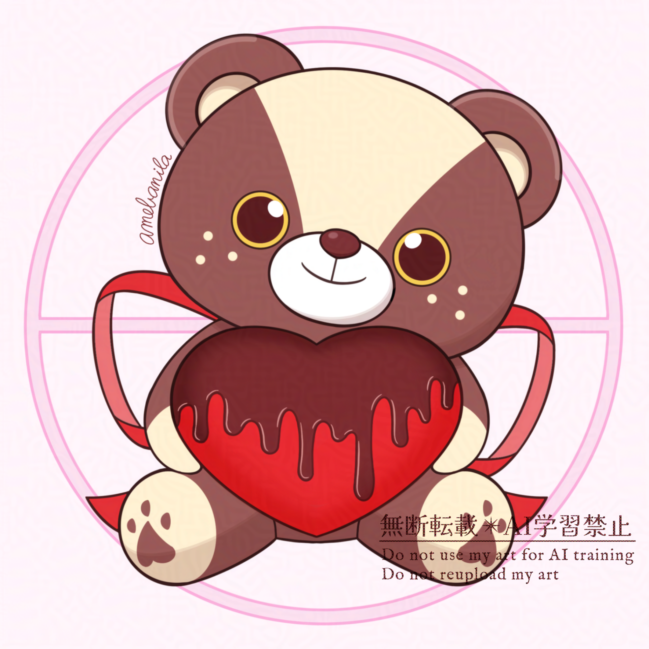 モチーフは「ギフト用のテディベア」+「ハート型のチョコレート」 バレンタインで告白する時、好きな人にプレゼントすると結ばれるという噂がある。 【該当サービス】 商用利用OK!かわいいモンスターをデザインします URL:https://skima.jp/item/detail?item_id=242524&sh=p45Rlwr