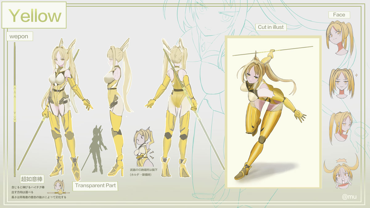 一般人であった人がある人工生物の一部の各部パーツを 身につけることで”変化”をコンセプトにしたキャラクターを イメージしてデザインしました。 黄色は"順応" 武器は超如意棒、棒術の使い手ではなく あらゆる物を使う鍛錬の末に輝かしい順応性を身につけた。 彼女の個性であり強みは努力の末の結果である