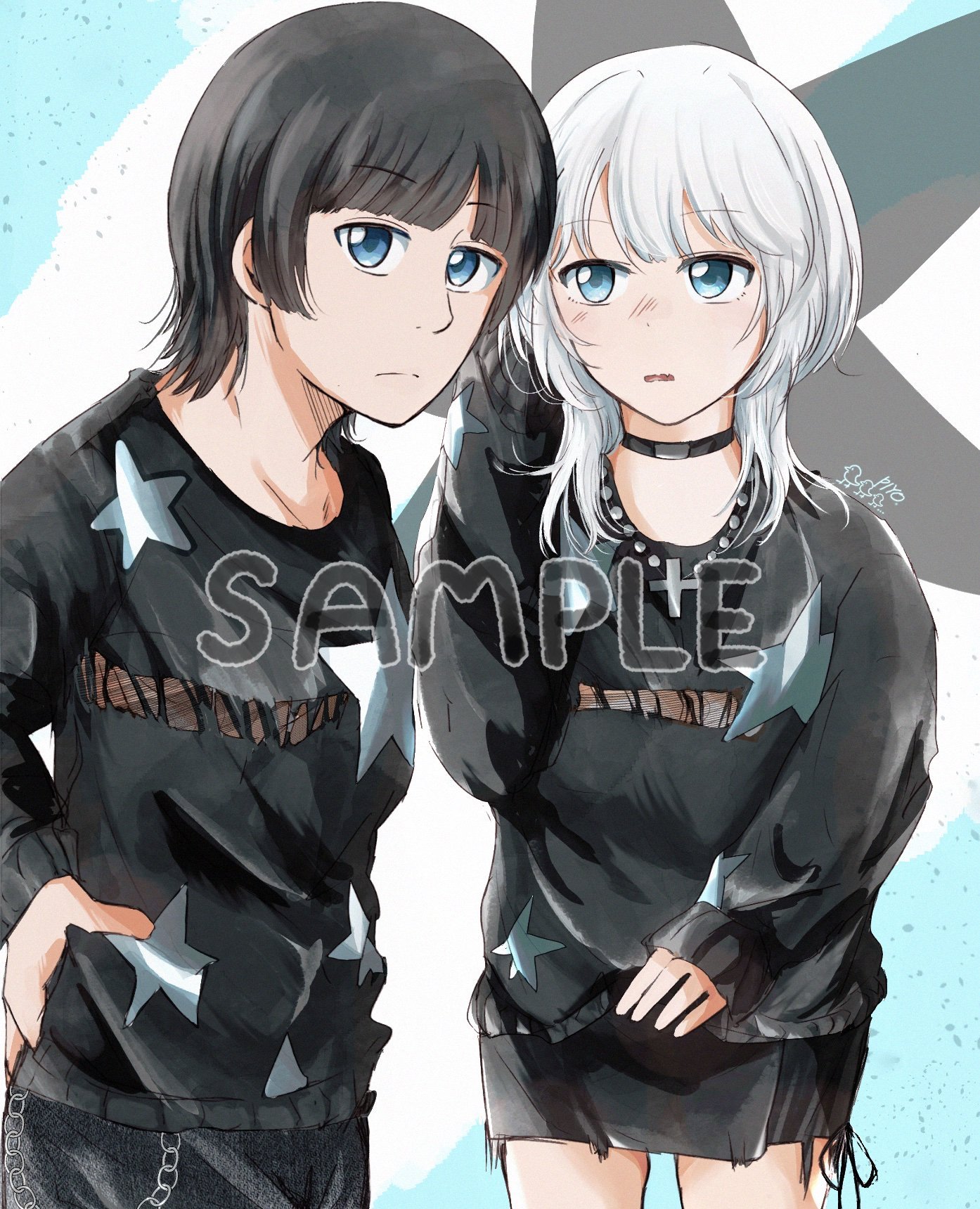 男女のカップルでご提示頂いたキャラクター資料を元に、パンク寄りのペアルックを意識しラフ提示無しで構図、背景等は全てこちらで描かせていただきました!