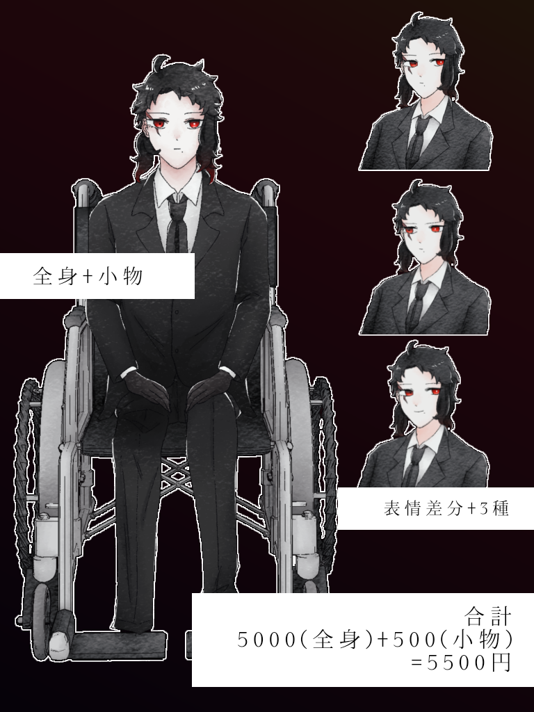 大体いくらくらいになるのかな〜でまとめてみました🫡 参考までに‼️ ーーーーー 通常立ち絵依頼(全身) →5000円 小物(車椅子) →500円 ー 合計 5500円 ※ポーズや小物が難しいものだと値段が変動いたします。 ーーーーー TRPGなどで使う際、こちら側に余裕があればになりますが、2枚目のようなディスプレイもご用意いたします。 100%ついてくるものでは無いのでご了承ください。