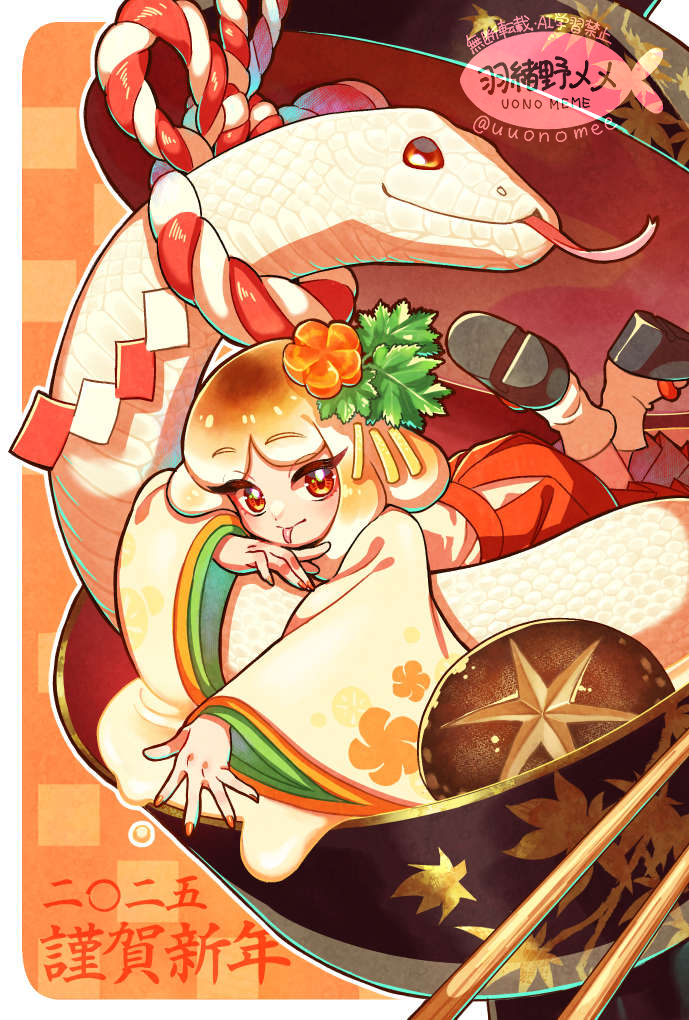 白みそのお雑煮に住んでいるお餅の神とそれに仕える巫女…のイメージで描きました。 うるし塗りの器のつや感がうまく描けたと思います。
