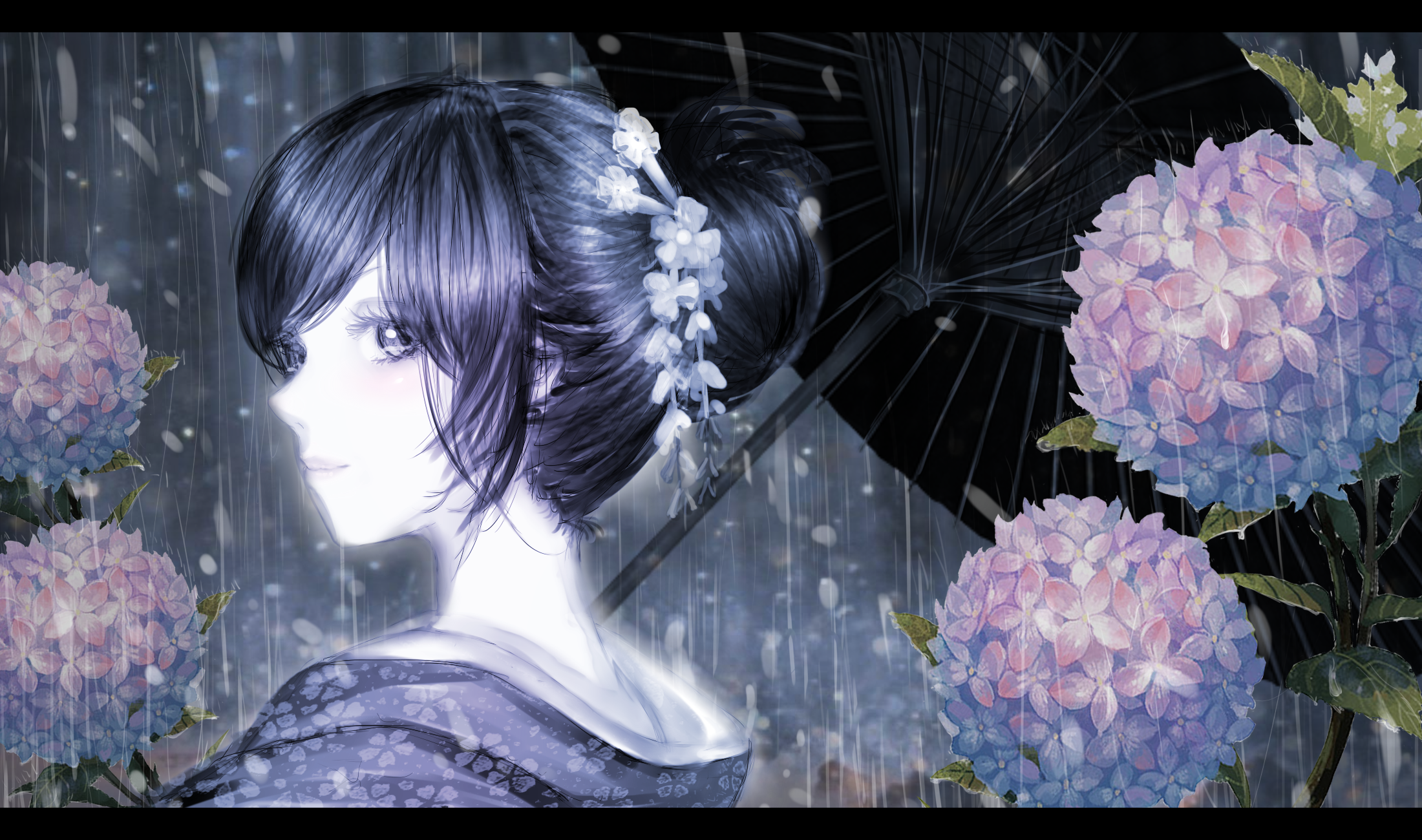 雨と紫陽花と和服の女性です。