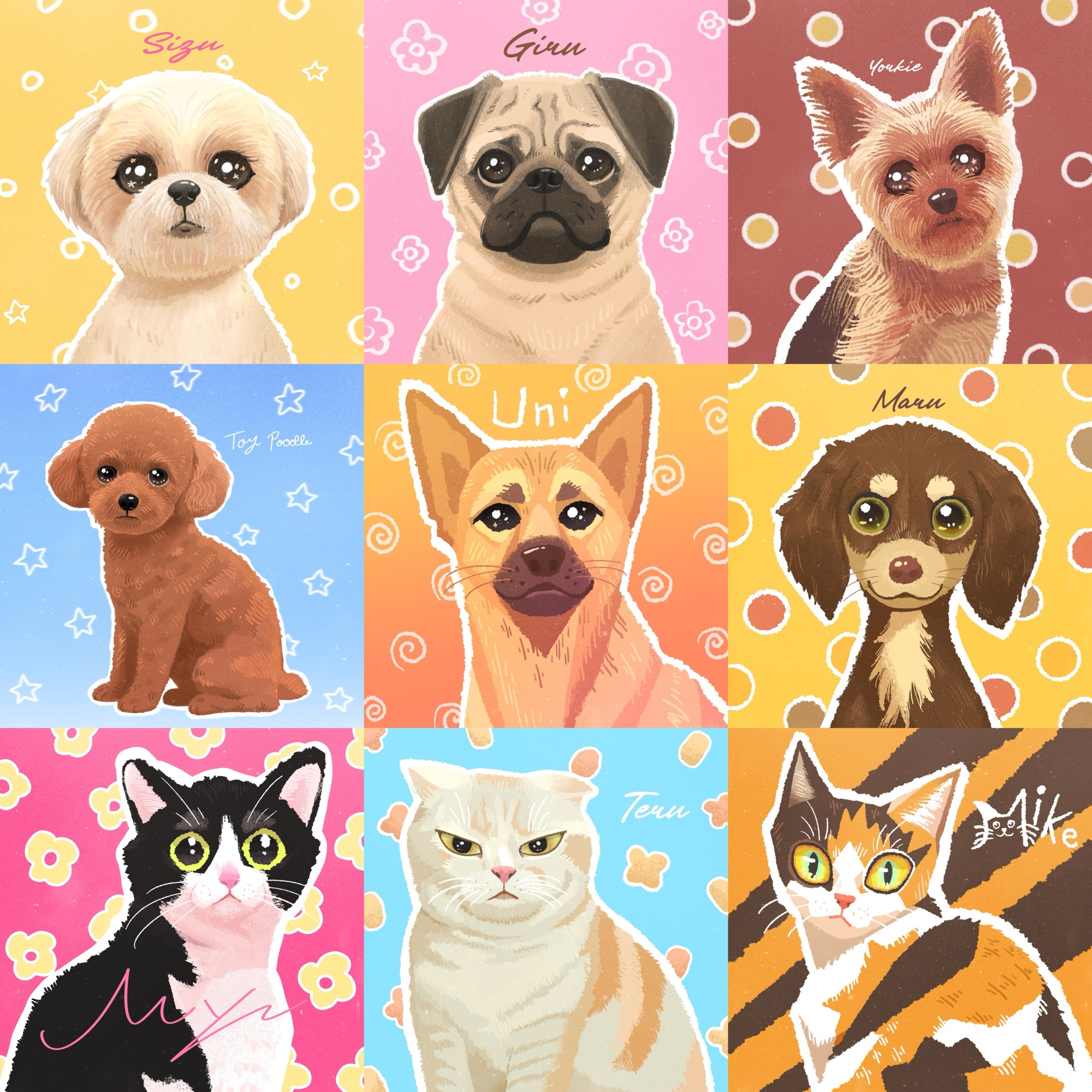 SNSアイコンなどで使用しやすい動物のイラストです。 お客様のお写真をもとに、「かわいさ」や「その子らしさ」が伝わるようにデフォルメしています♪