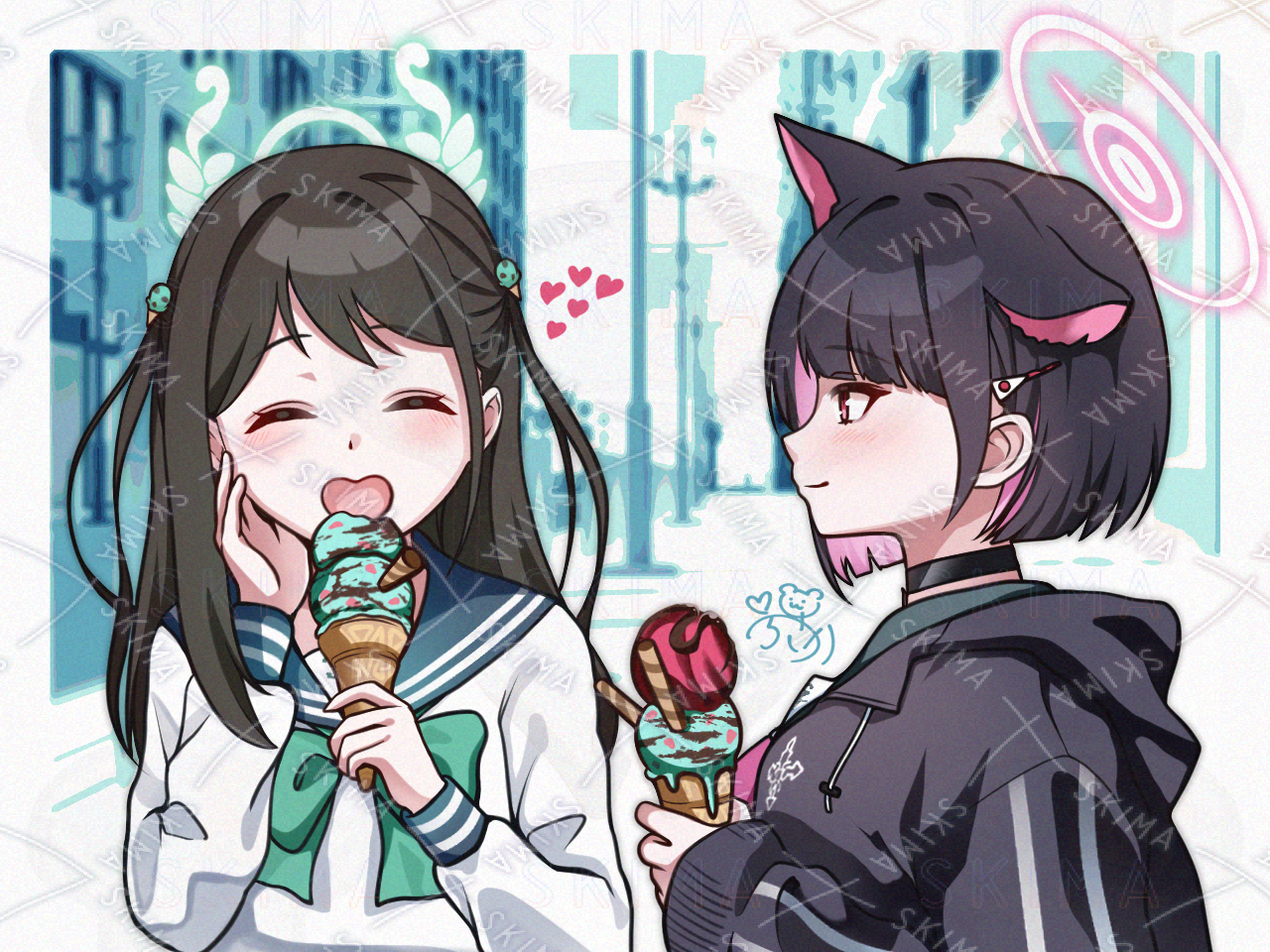 『ブルーアーカイブ -Blue Archive-』、栗村アイリと杏山カズサのファンアートです。チョコミントよりもチョコミントっ。
