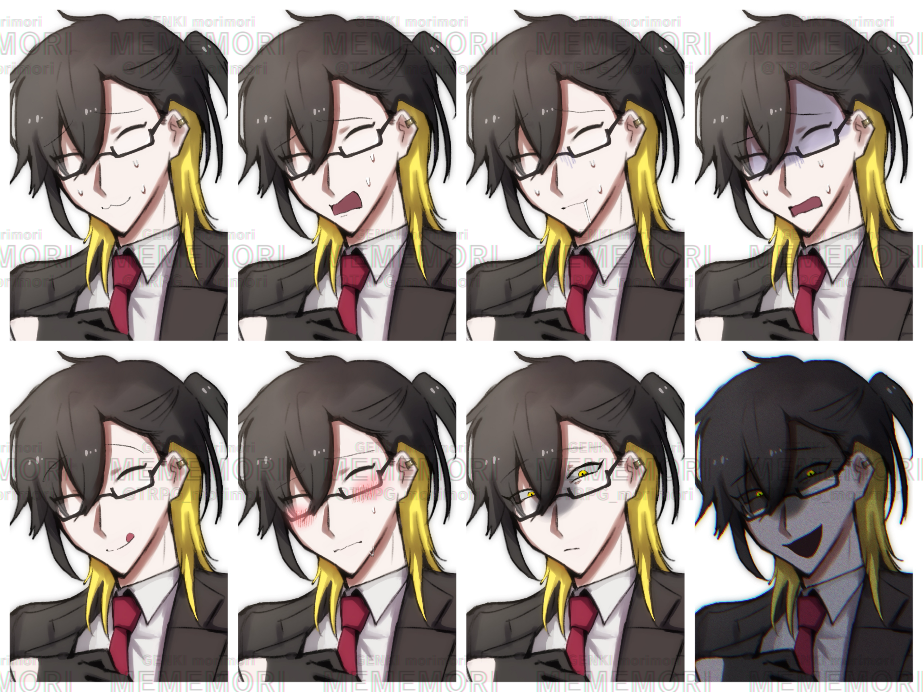 私がTRPGにて使用した立ち絵です。 2枚目には表情差分アリ。 糸目の怪しくて胡散臭い男性。 このような装飾の少ないシンプルな立ち絵+アニメ塗りでしたら比較的短時間(5時間前後程)で作成する事が可能です。 コミカルなものや怖い顔、オーバーな感情表現等振れ幅の大きい表情差分を作るのが得意です。 🌟特に得意な表情差分→ガチギレ/あざとい/ゲス顔 🔍検索用 詐欺師 スーツ 黒髪 メガネ 眼鏡 手袋 インナーカラー