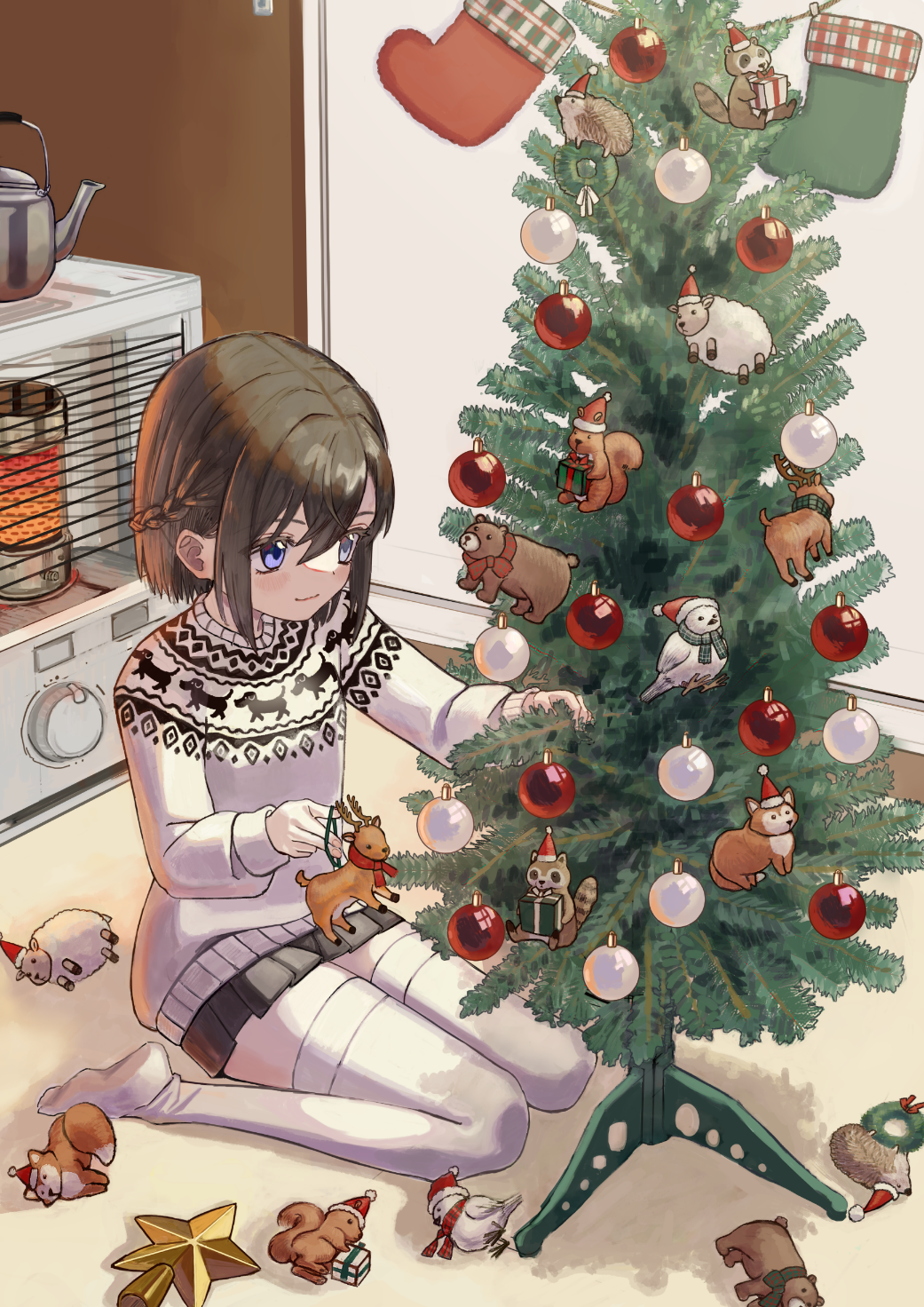 ツリーにかわいらしい動物のオーナメントを描きました。