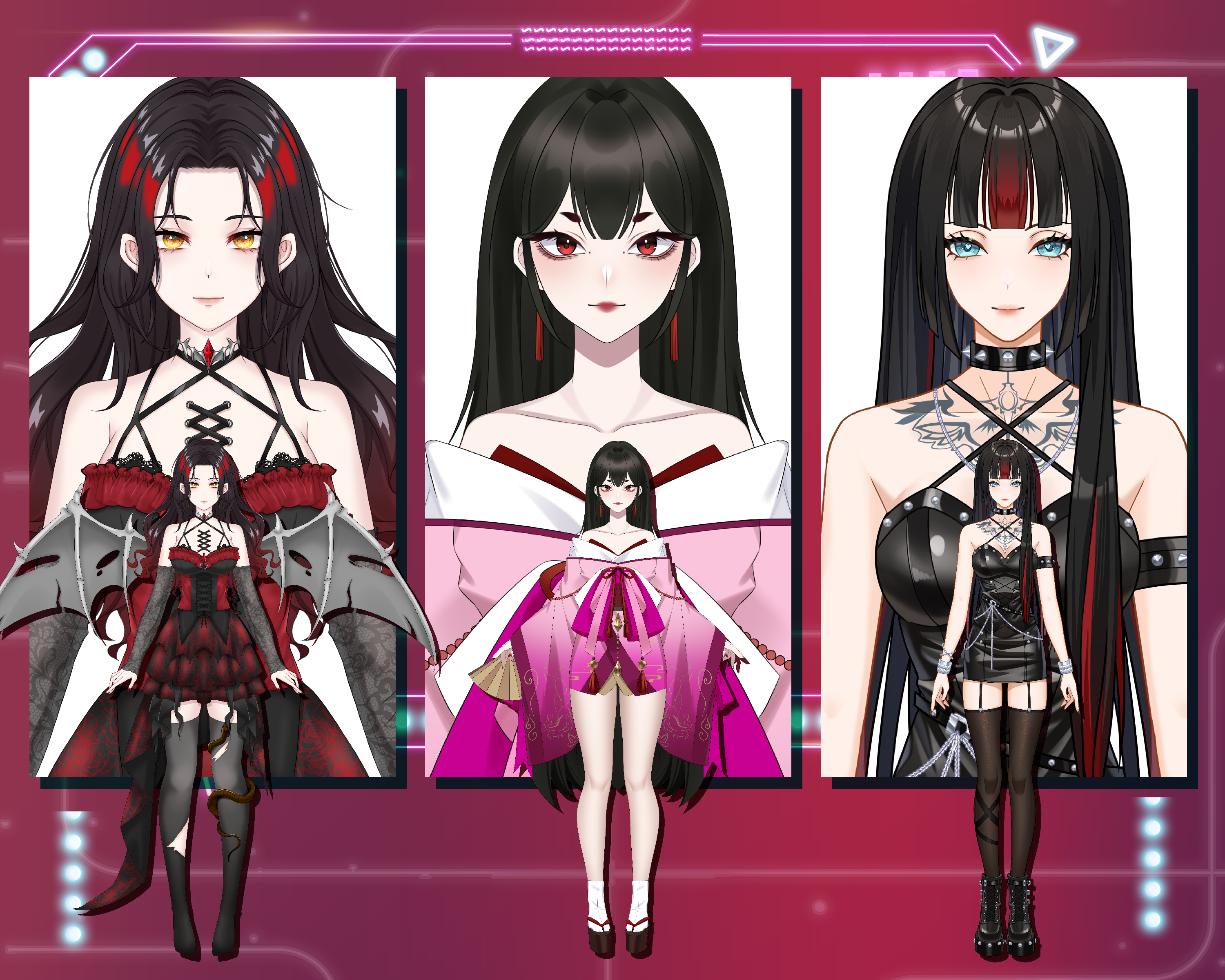 黒基調のレザードレスにタトゥー風の模様、アクセサリーを多数使用したクール系デザイン。大人っぽさ・強さ・色気を兼ね備え、ステージ映えするヴィジュアルが特徴です。赤黒のカラーアクセントを髪に取り入れることで統一感を演出し、全体的に“圧倒的な存在感”を狙ったキャラクターになっています。歌勢・雑談勢・ゲーム勢どの活動ジャンルでも輝きやすいタイプです。