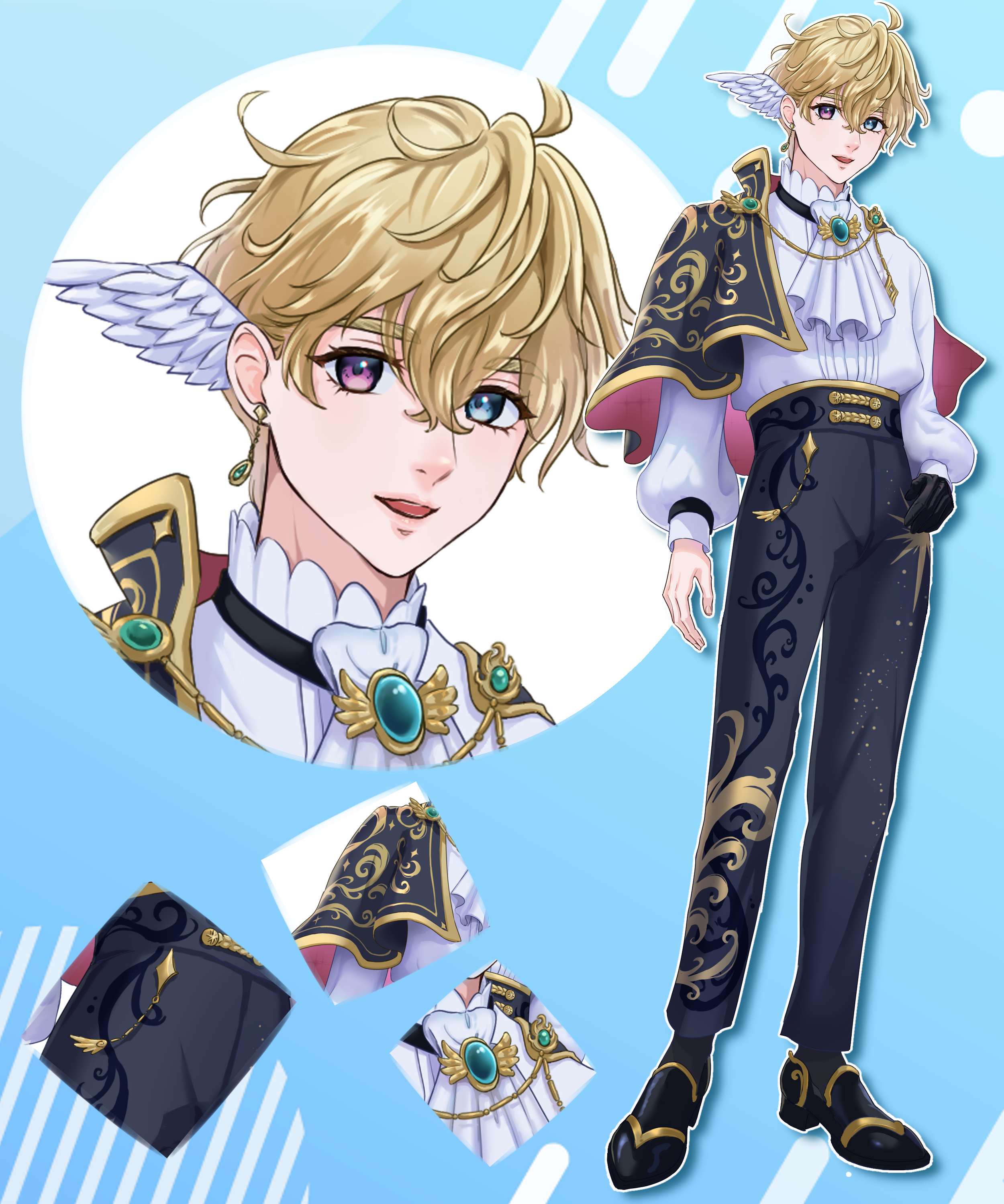 Vtuber・IRIAMなどの配信用、TRPGやゲーム制作、グッズ用に想定した立ち絵です。 天使×王子様をイメージして王道の爽やかな金髪に、ピンクとブルーのオッドアイ、高貴な雰囲気のある装飾を盛り込みました。