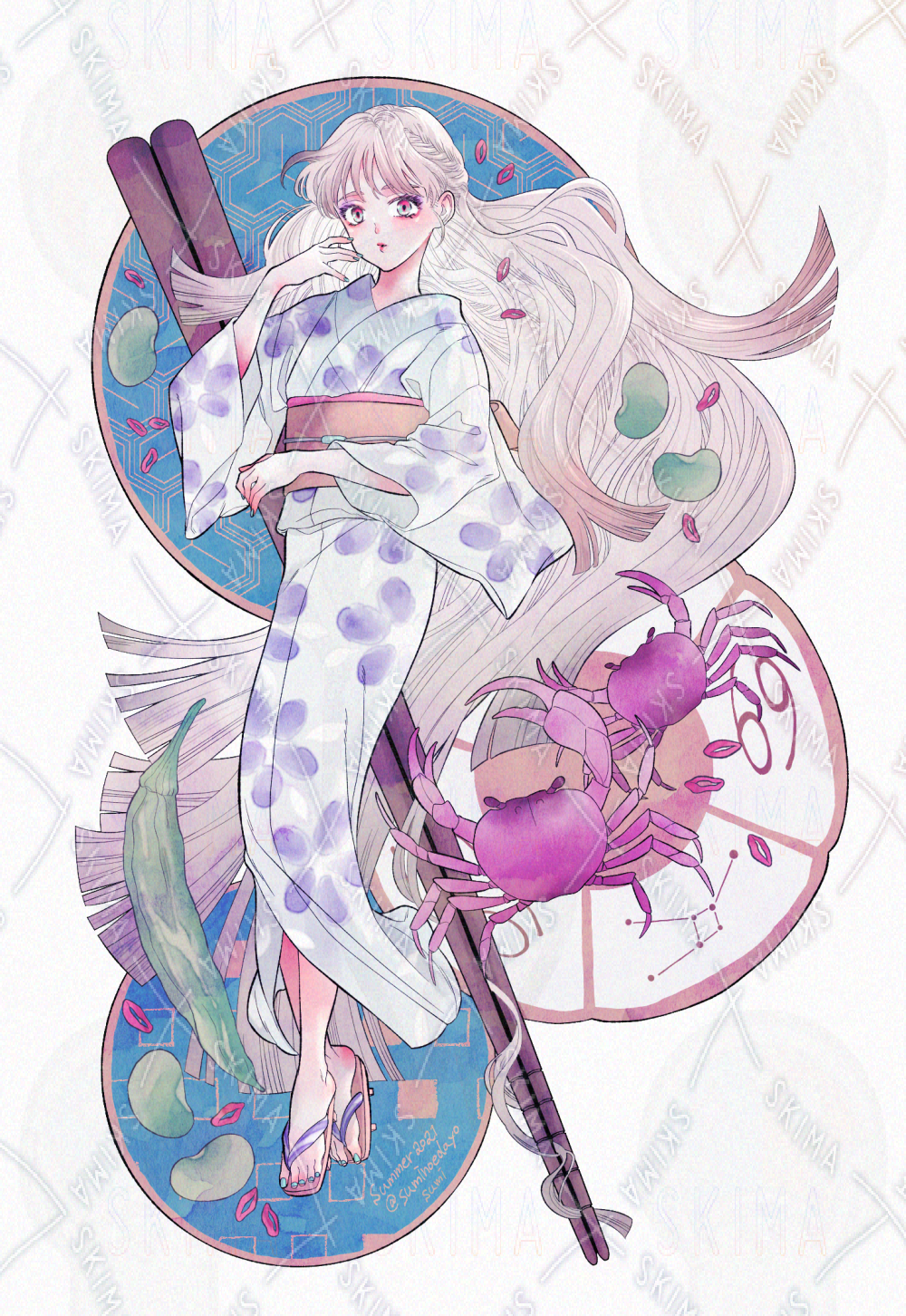 暑中見舞い用に描いたイラストです。髪をそうめんに見立て、6〜7月の太陽星座である蟹をサワガニで表現しました。
