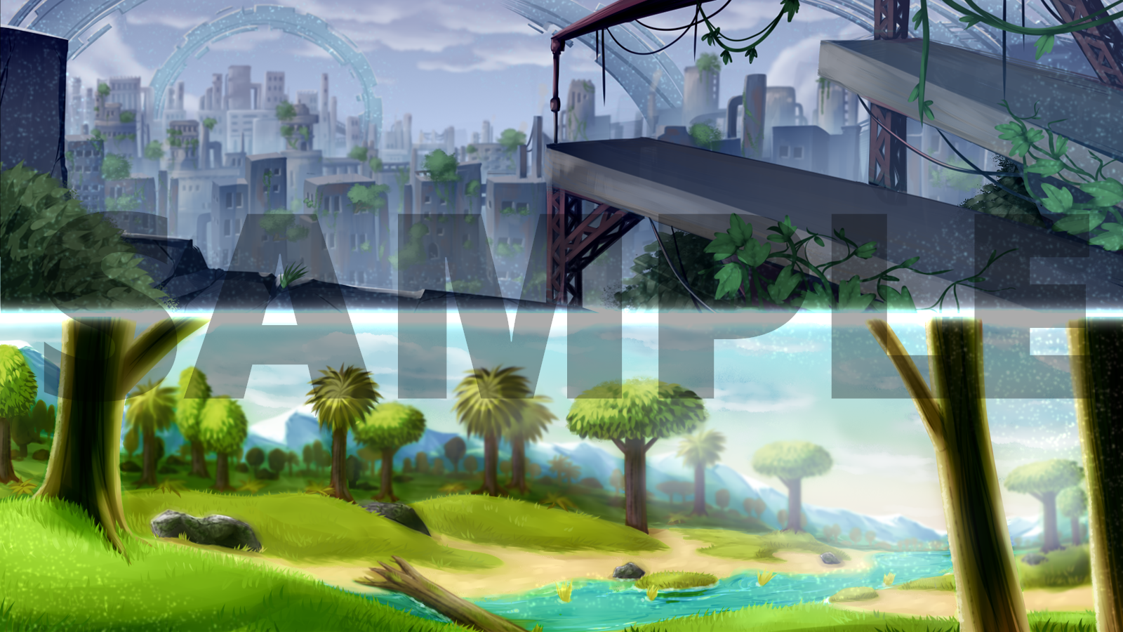 こちらは、キャラクターイラストや一枚絵に使用できる背景サンプルです。 動画サムネイルやイベント用ビジュアルなど、用途や雰囲気に合わせた背景イラストを制作いたします。 キャラクターに合わせて描き込んだ背景や、雰囲気重視のワンポイント背景など、さまざまなタイプに対応可能です。 ご依頼の際は、こちらのサンプルを参考に描き込みの度合いをご相談ください。