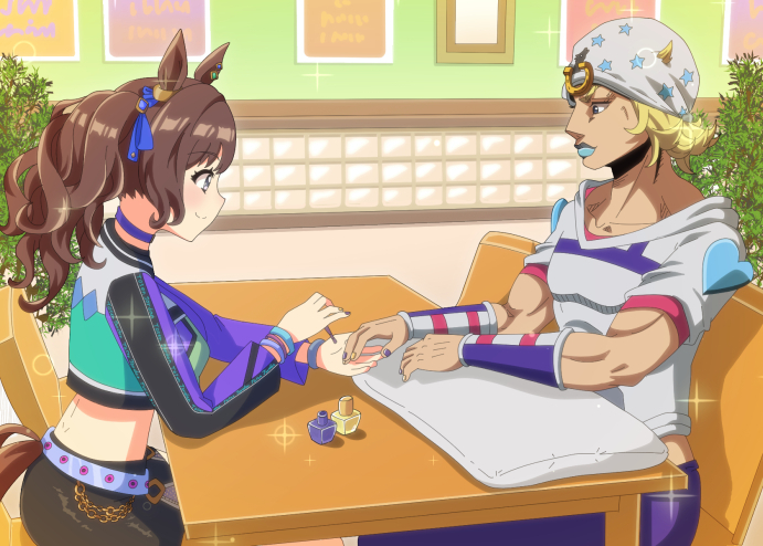 ジョジョの奇妙な冒険スティールボールランのジョニィ・ジョースターがウマ娘プリティーダービーのトーセンジョーダンにネイルアートをされているイラストです。