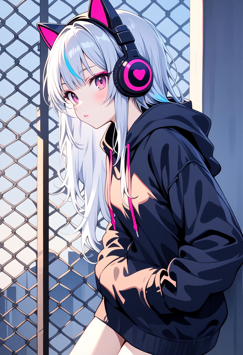 黒いパーカーを着ている。両手をパーカーのポケットにいれて、学校の屋上の金網のフェンスにもたれかかっている。真横からのアングル。視線だけを横目でカメラに向けている。