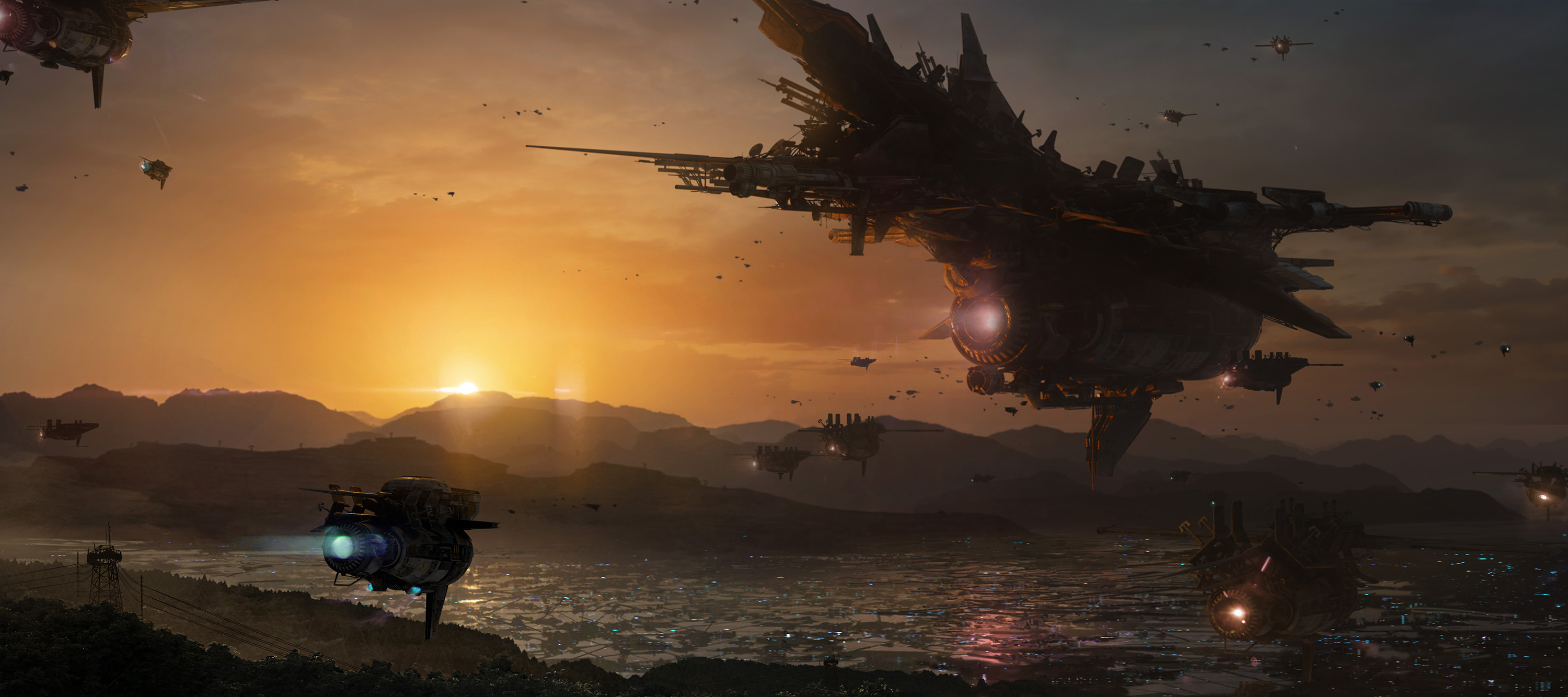 日本の田舎街の上空を占拠する巨大艦隊。