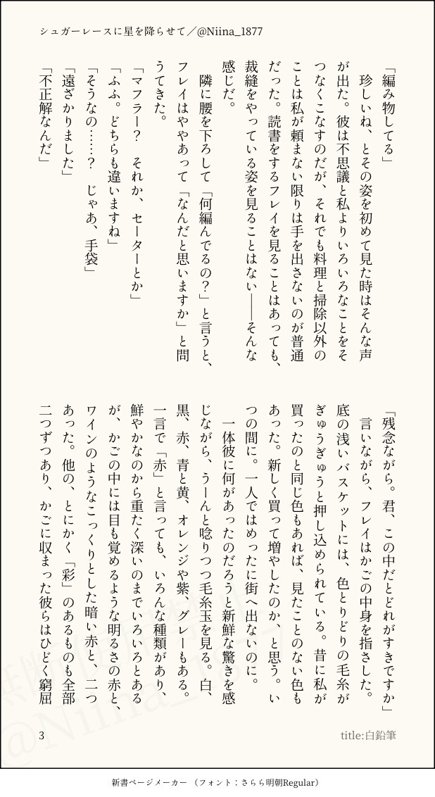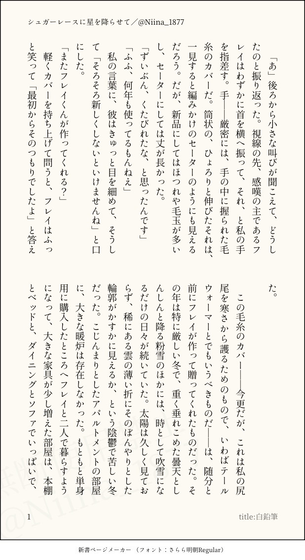 2025年12月現在の文体サンプルです。 小説のご依頼を検討していただく際の参考になりましたら幸いです。 総文字数:約6700字 ※作者の名義や記載IDが異なっておりますが、こちらは版権用アカウントで使用している別名義になります。 ※FF14(ファイナルファンタジーXIV)の二次創作小説をサンプルとして掲載しておりますが、該当作品を含む版権作品の二次創作の執筆ご依頼はお引き受けしておりません。恐れ入りますが、何卒ご理解いただけますと幸いです。