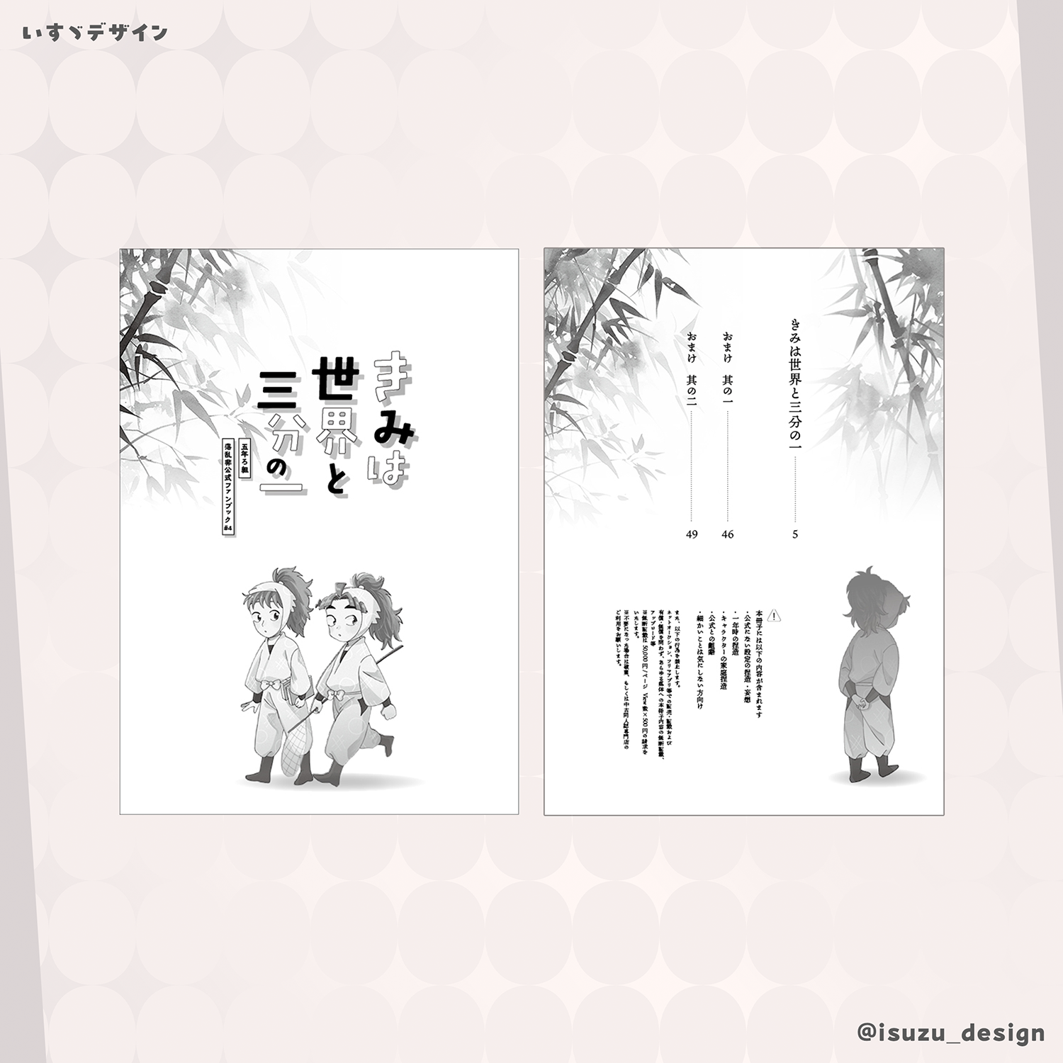 おちび様(#oh_chibi_bi)より、表紙・大扉・目次のデザインを担当しました。 あたたかみのあるイラストが引き立つようにデザインさせていただきました。 A5サイズカラー表紙/マットPP加工/目次・大扉2P/ブロス印刷様にて印刷 オプション「サークルポスター追加」+2000円