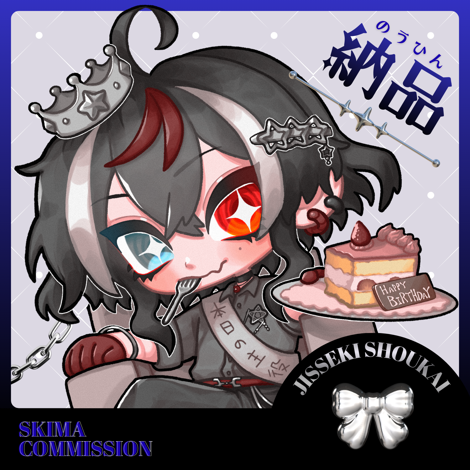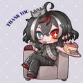 ご依頼いただき制作したSDイラストです。 中世的な印象かつ黒×シルバーのカラーイメージがくっきりするよう、パキッとした塗りにしました。 今回はお誕生日プレゼントとのことだったので、イメージに沿った王冠や、キャラクターデザインの差し色として使用されている赤色から連想し、いちごのケーキを描き入れています。