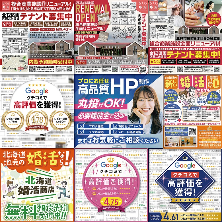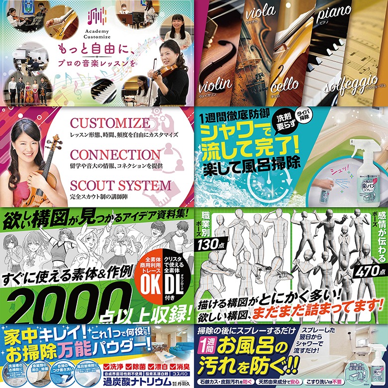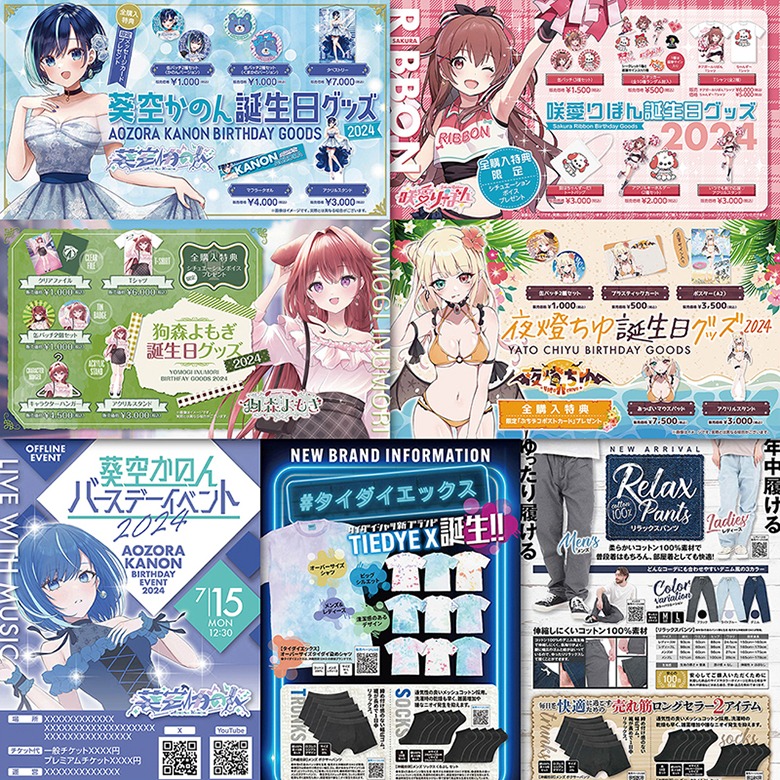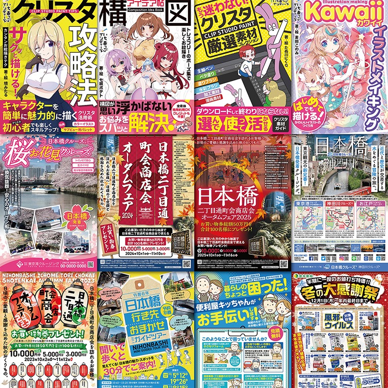 ●1枚目:VtuberWEB告知画像・A4チラシ各種 ●2枚目:kindle表紙・チラシ・ポスター各種 ●3枚目:チラシ・営業案内・ポスター各種 ●4枚目:HP画像・kindle AmazonA+用バナー・店内パネル ●5枚目:チラシ・WEB画像各種 ●6枚目:Instagram画像・WEB画像・雑誌広告各種