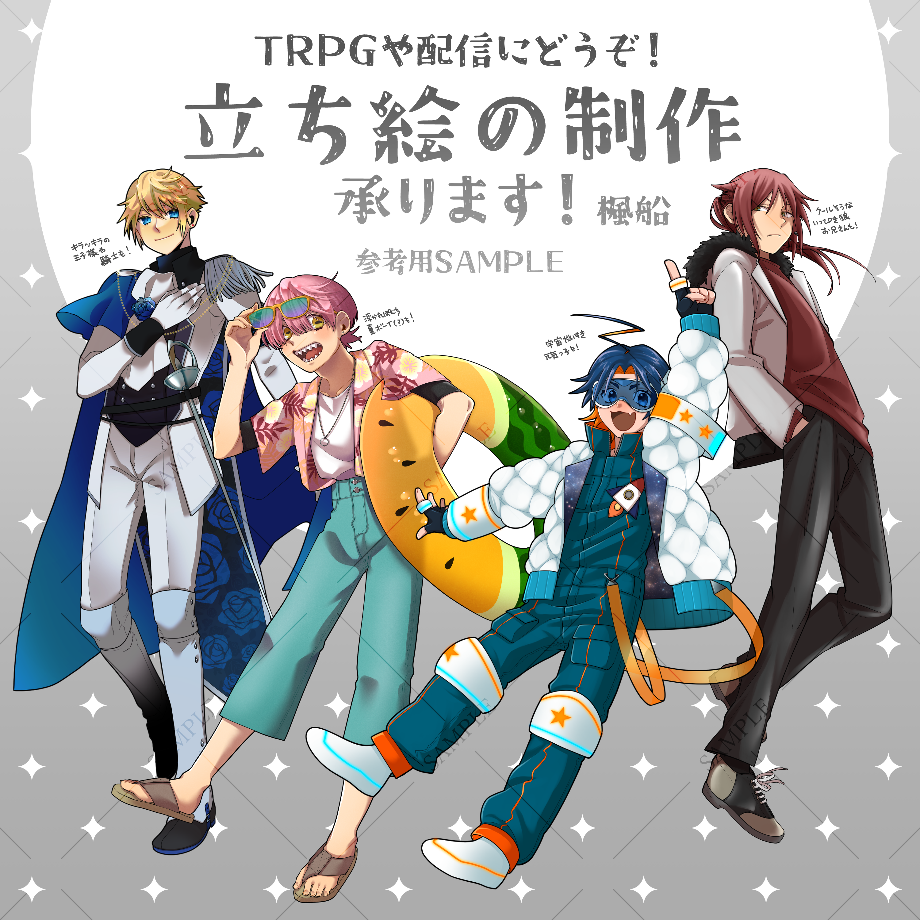 閲覧ありがとうございます! ご依頼の参考になりそうな過去制作イラストをまとめました。 コミッションに出てないものや、うちよそイラストのご依頼も大歓迎です! お気軽にご相談ください! どうぞよろしくお願い致します。 楓船